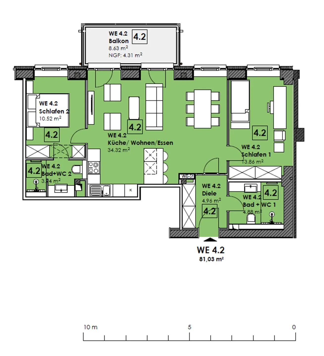 - Wohn/Essbereich: Sofa, Sitzbereich, Essbereich, TV, Elektrokamin, Zugang zum Balkon