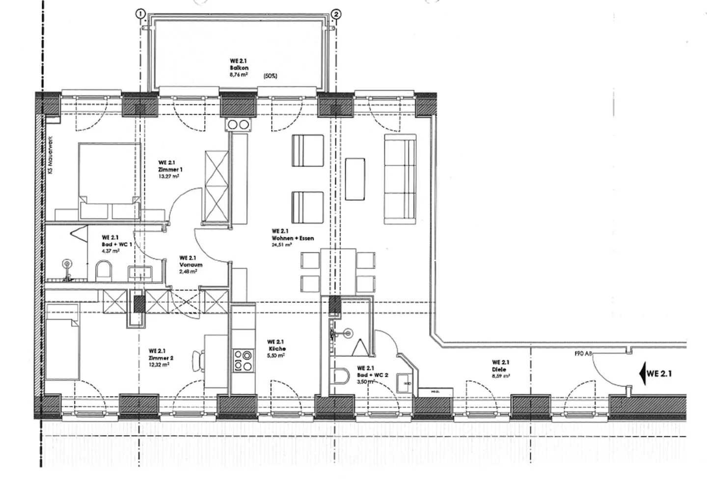 - Wohn/Essbereich: Sofa, Sitzbereich, Essbereich, TV, Zugang zum Balkon