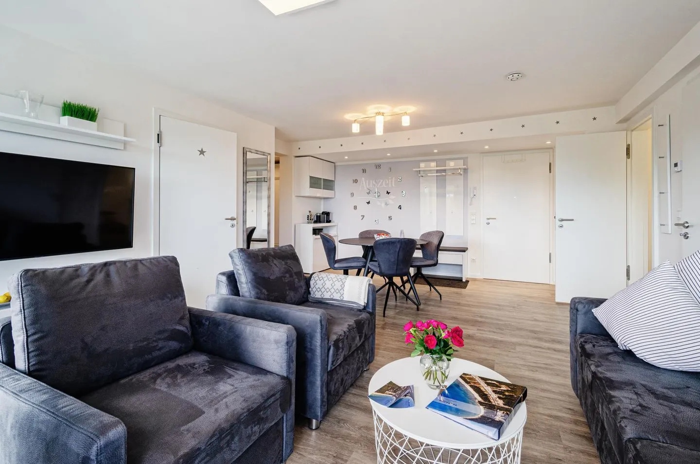 Im Wohnzimmer und in den beiden Schlafzimmern befinden sich je ein wandhängender Flat Screen-Smart-TV. WLAN- und Netflix-Zugang sind selbstverständlich kostenfrei.