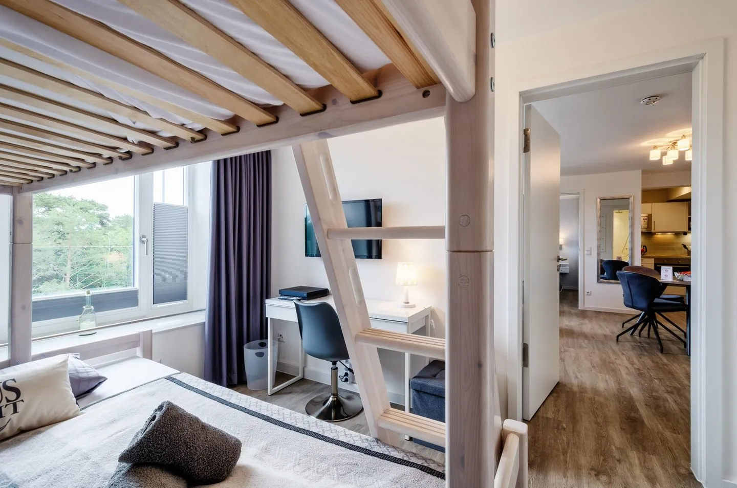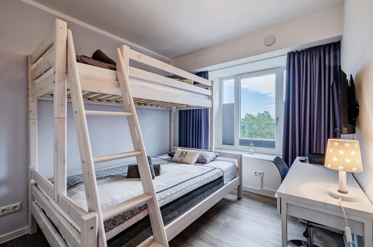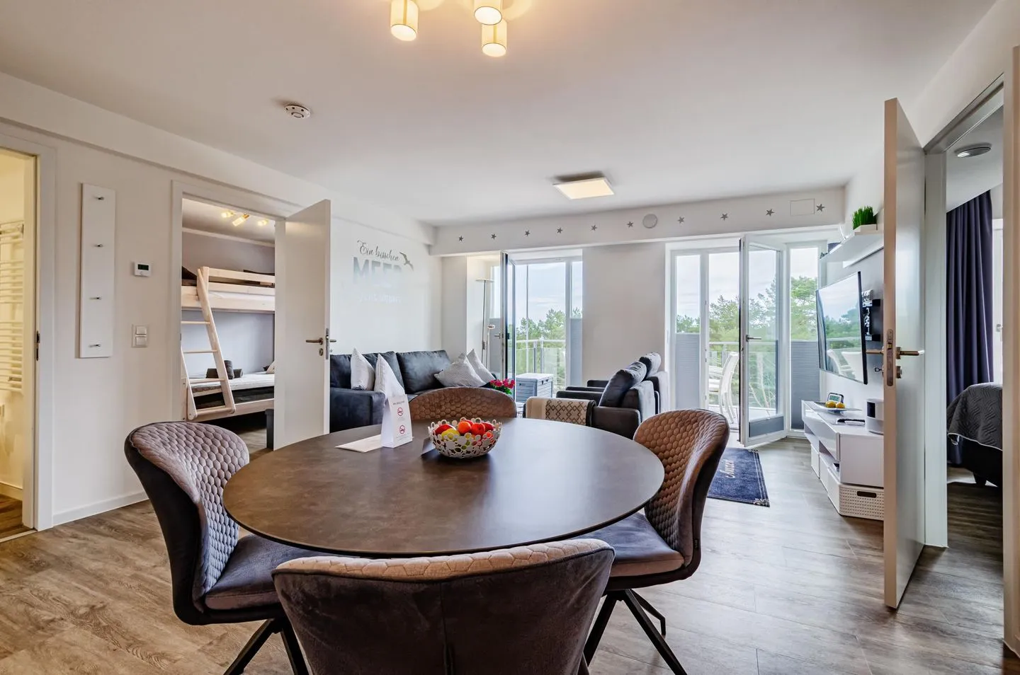 Alle Zimmer sind zum Meer ausgerichtet. Das Apartment besitzt zwei Schlafzimmer, wovon eines mit einem Boxspring-Doppelbett (180x200cm) und eines mit einem Etagenbett (Liegeflächen unten 140x200cm und oben 90x200cm) ausgestattet ist. Damit eignet sich das Apartment auch hervorragend für Familien. Die Kinder werden sich besonders über den feinsandigen Strand freuen, der zum Buddeln und Sandburgen bauen einlädt. In der Wohnung stehen ein paar Spiele sowie eine Xbox-OneX-Konsole (inkl. 2 Controller) und ein Netflix-Account zur Nutzung bereit.