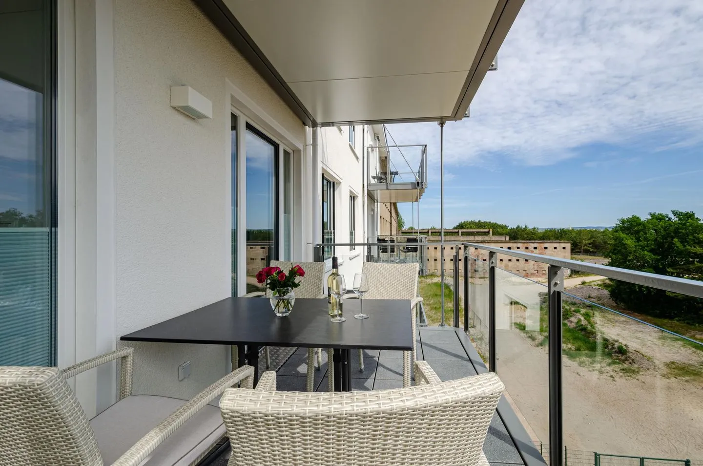 Die Ferienwohnung befindet sich nur wenige Schritte von dem wunderschönen, kilometerlangen, weißen Sandstrand der Prorer Wiek entfernt. Von dem Glasbalkon aus können Sie durch die Bäume das Meer sehen und rauschen hören. So können Sie Ihren Urlaub sofort genießen.