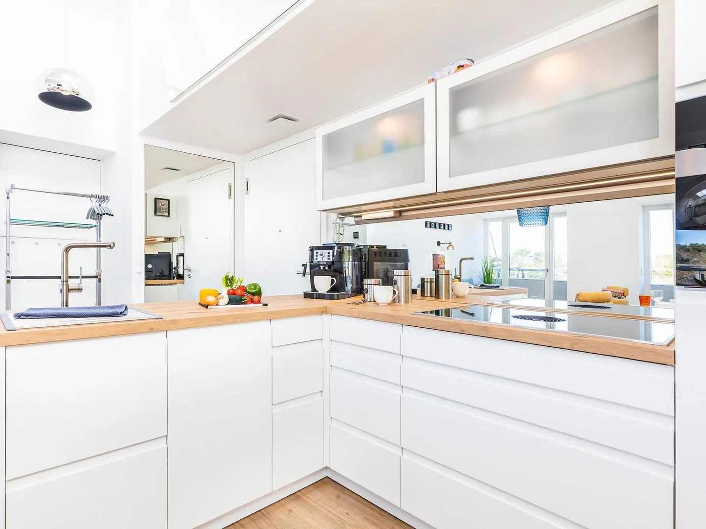 - Einbauküche, voll ausgestattet: Induktionskochfeld, Backofen mit Mikrowelle (Kombigerät), Kühlschrank, Gefrierschrank, Geschirrspüler, Kaffeevollautomat, Milchaufschäumer