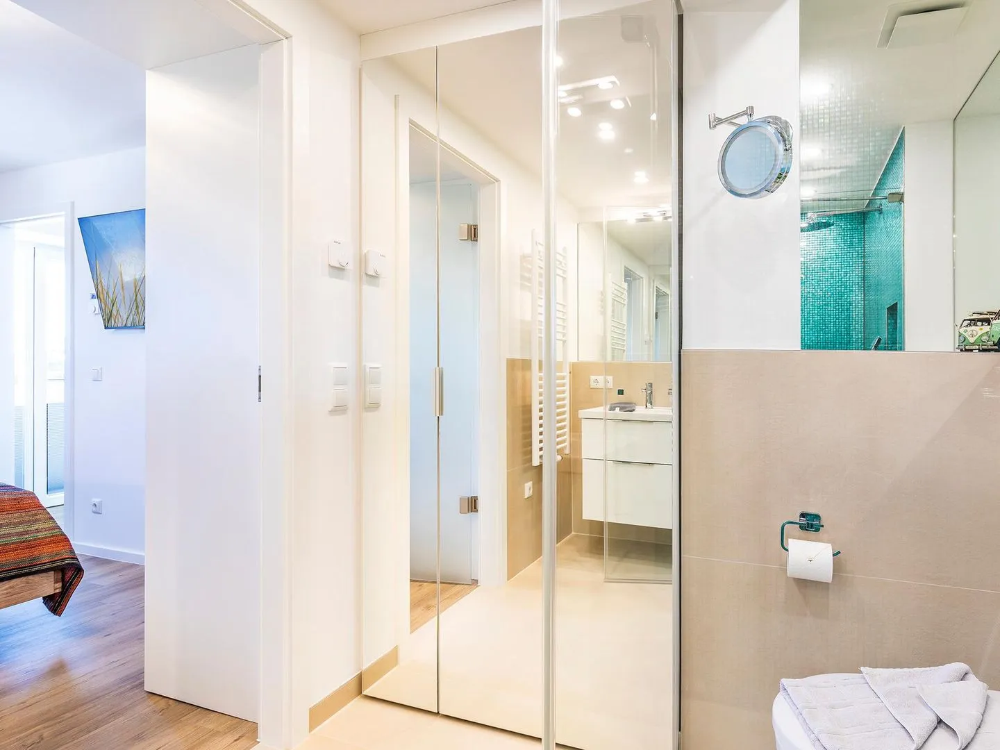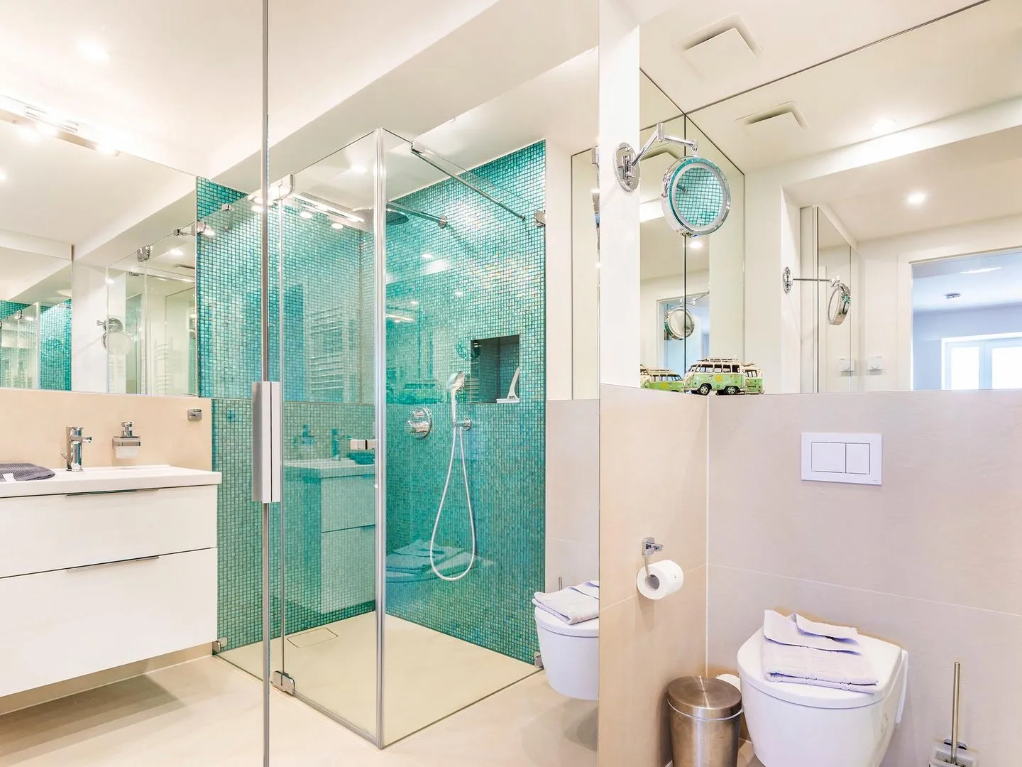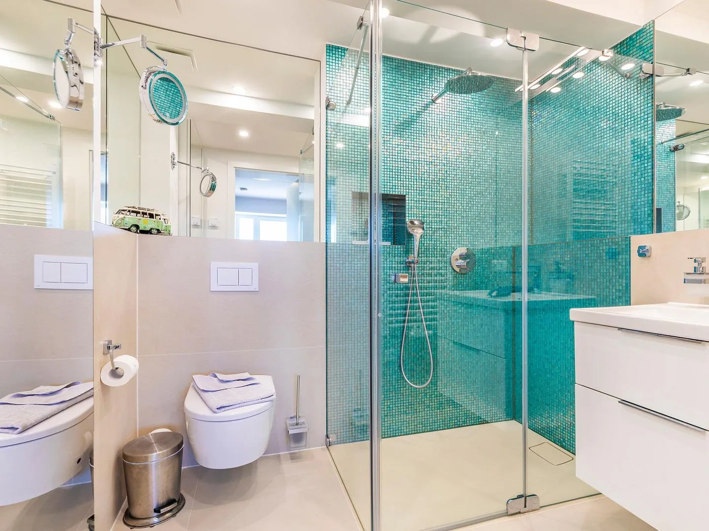 - Zwei Duschbäder (en suite) jeweils mit Regendusche bodengleich, Handbrause mit Wechselstrahl, WC, Haartrockner, Handtuchheizkörper, beleuchtetem Kosmetikspiegel