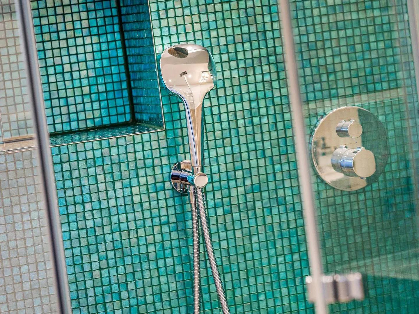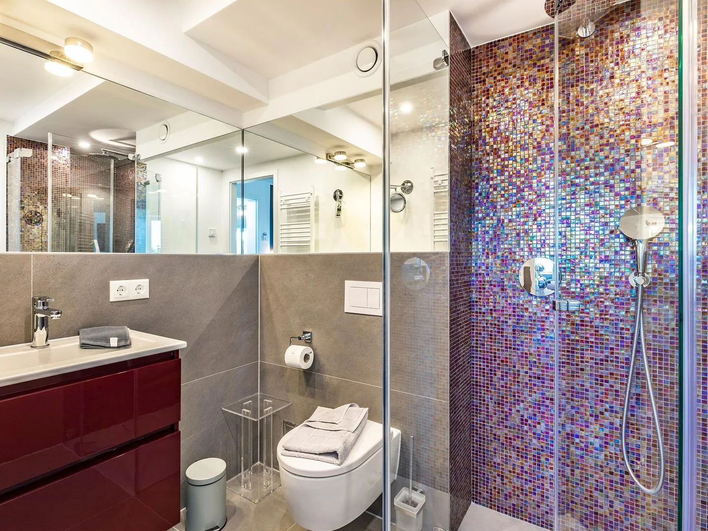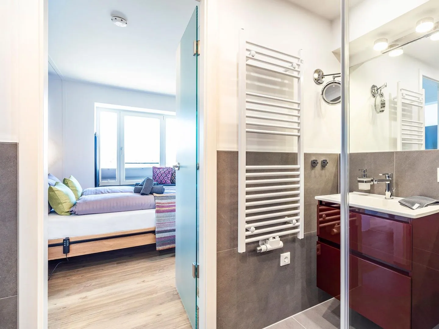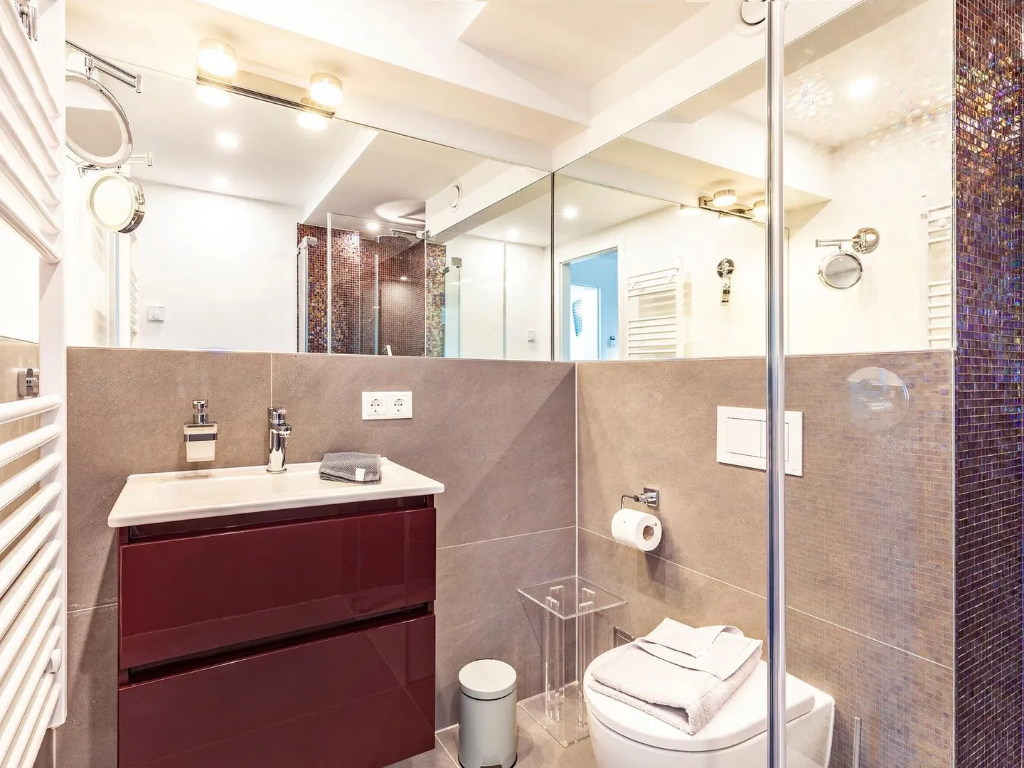 - Zwei Duschbäder (en suite) jeweils mit Regendusche bodengleich, Handbrause mit Wechselstrahl, WC, Haartrockner, Handtuchheizkörper, beleuchtetem Kosmetikspiegel