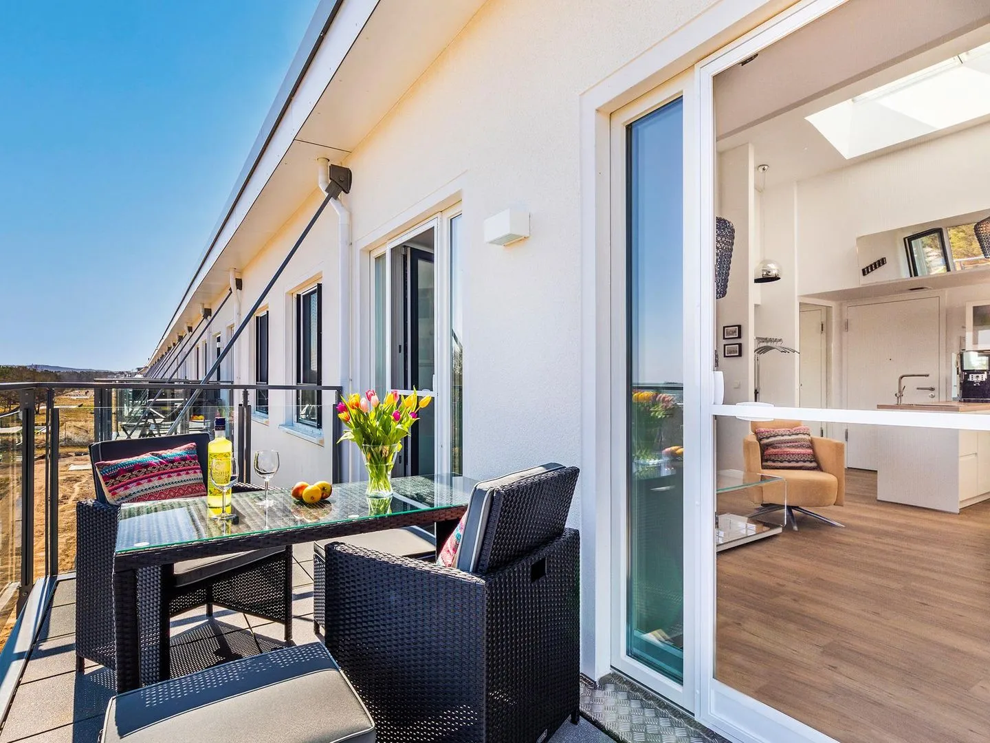 Der möblierte Balkon lädt zum entspannten Frühstück ein oder bietet nachmittags an heißen Tagen ein schattiges Plätzchen. Erfreuen Sie sich im Sommer am fein-harzigen Aroma des nahen Küstenwäldchens und schlafen Sie infolge der Insektenschutzgitter beruhigt auch bei offenem Fenster, während im Hintergrund die Wellen rauschen.