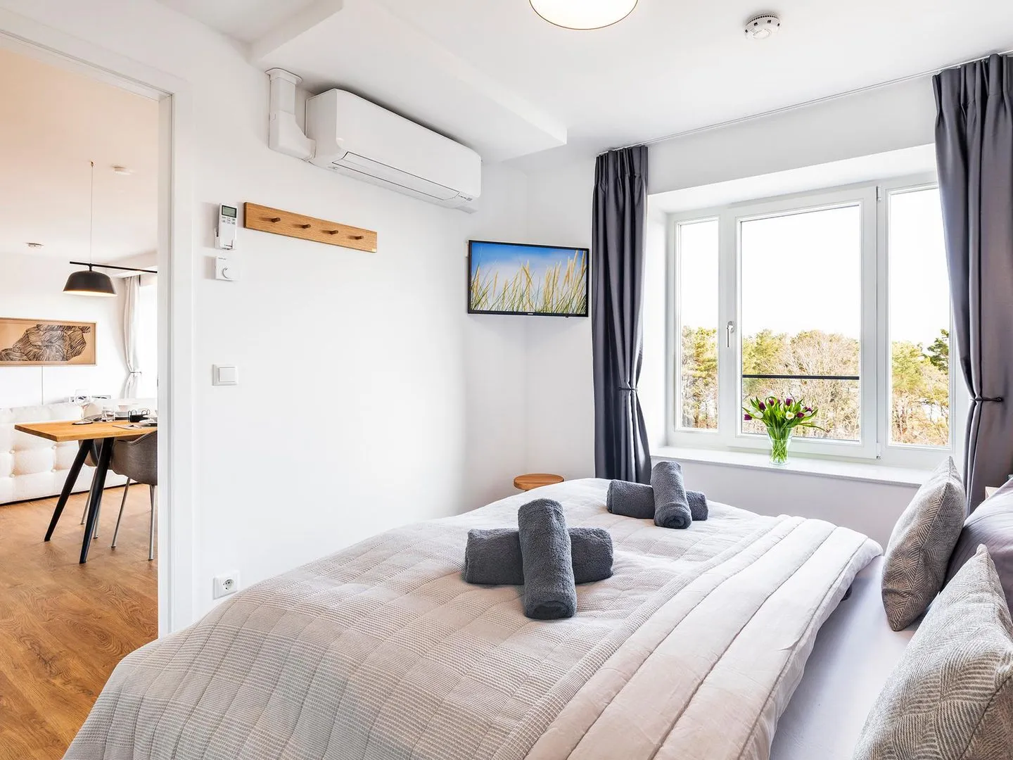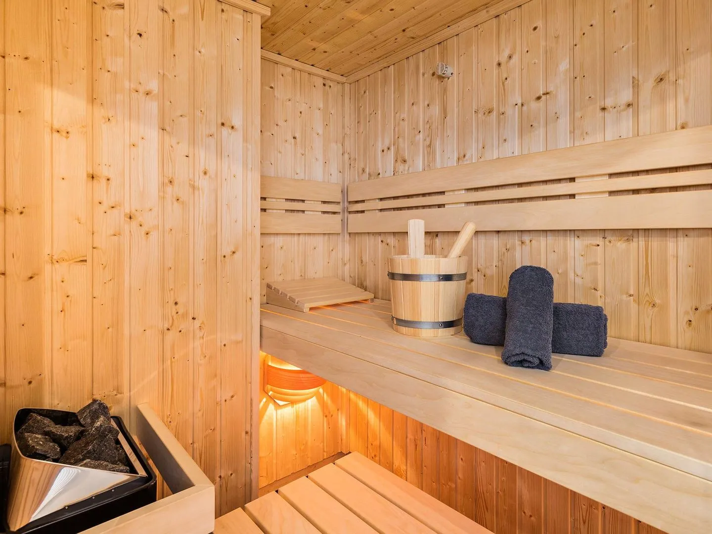Für Abkühlung ist im Sommer durch eine Klimaanlage gesorgt, während Sie sich an kalten Winterabenden in Ihrer eigenen Sauna aufwärmen können. Falls doch einmal Langeweile aufkommen sollte, bieten das kostenfreie WLAN, Netflix sowie Primevideo auf den 3 QLED-TVs ausreichend Unterhaltung.