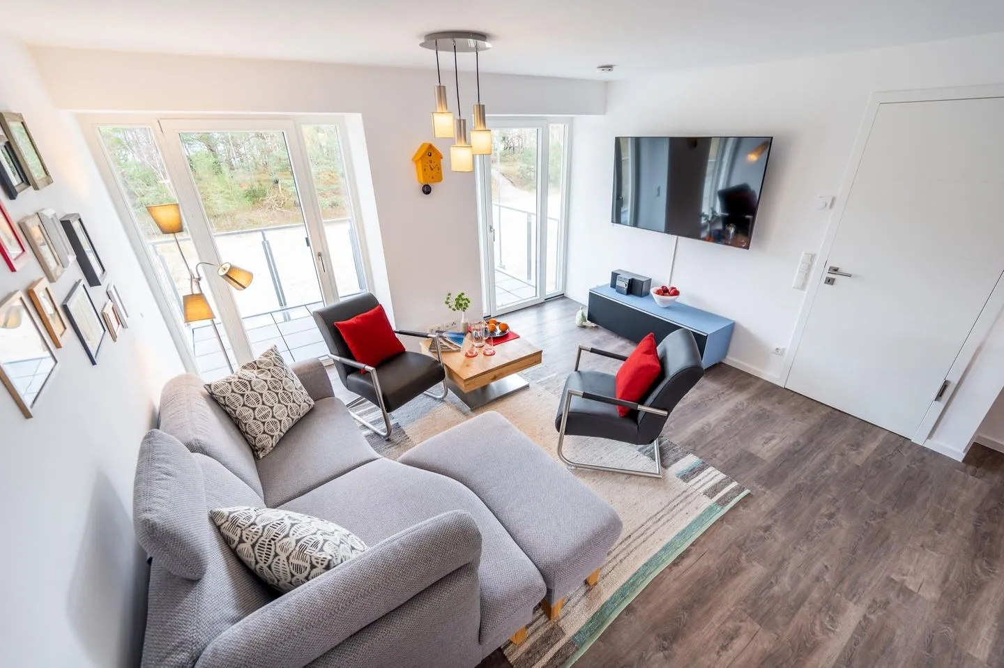 Aus dem Wohnraum und beiden strandseitigen Schlafzimmern haben Sie Blick auf die sanfte Dünenlandschaft und dahinter auf das Meer. So werden nicht nur die bequemen Sitzmöbel, sondern auch die Fensternischen schnell zum Lieblingsplatz. Der Wohnraum und beide Schlafzimmer verfügen über moderne TV-Geräte. Auf dem Balkon können Sie ungestörte Stunden begleitet vom Meeresrauschen genießen. Hier kann und soll man sich wohlfühlen!
