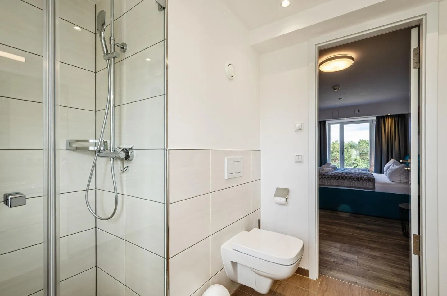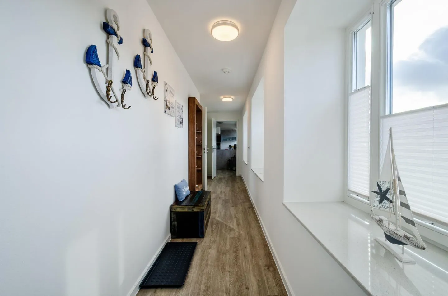 Hier bin ich Mensch ? Hier darf ich es sein. Im Heimathafen im 5. Obergeschoss mit dem Blick auf das Meer, dem Geruch der frischen Brise, dem wiegen der Bäume und dem Gefühl des Loslassens, kurz: jetzt ist Urlaubszeit. Koffer fallen lassen und schnell hinauf auf die Dachterrasse. Sie werden begeistert sein. In diesem Nichtraucher-Apartment werden Sie sich sofort wohlfühlen. Ein offener Wohn- und Kochbereich empfängt Sie. Bodentiefe Fenster geben den Blick frei, von hier aus können Sie auch den verglasten Balkon betreten. In zwei gemütlichen Schlafzimmern können Sie, mit Blick zum Meer und dem flüstern der Wellen, seelenruhig einschlafen. Sie haben hier die Möglichkeit gemeinsam oder getrennt zu Duschen, ein zweites Bad steht Ihnen ebenfalls zur Verfügung.