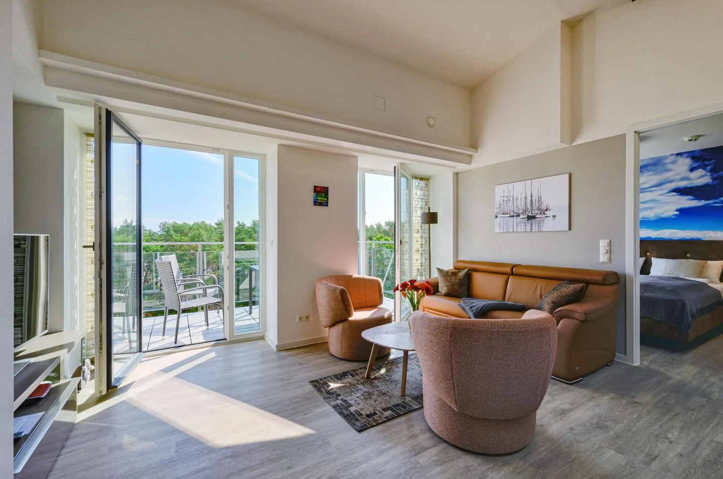 - Wohn/Essbereich: Sofa, Sitzbereich, Essbereich, TV, Zugang zum Balkon
