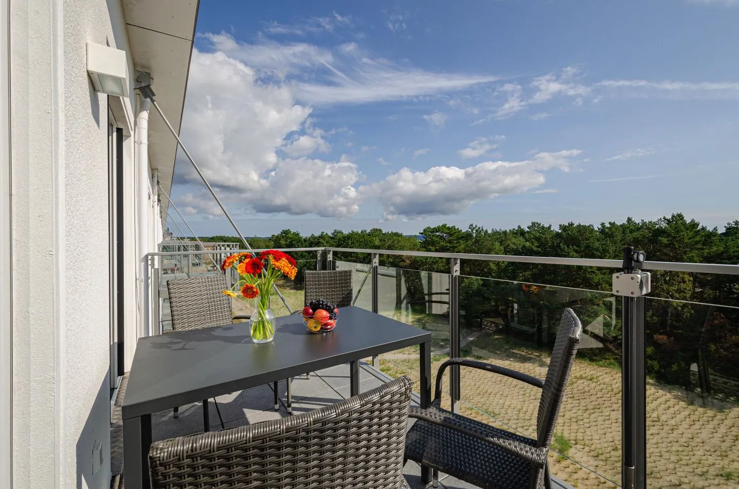 - Balkon mit Tisch und 4 Stühlen, Blick auf das Meer