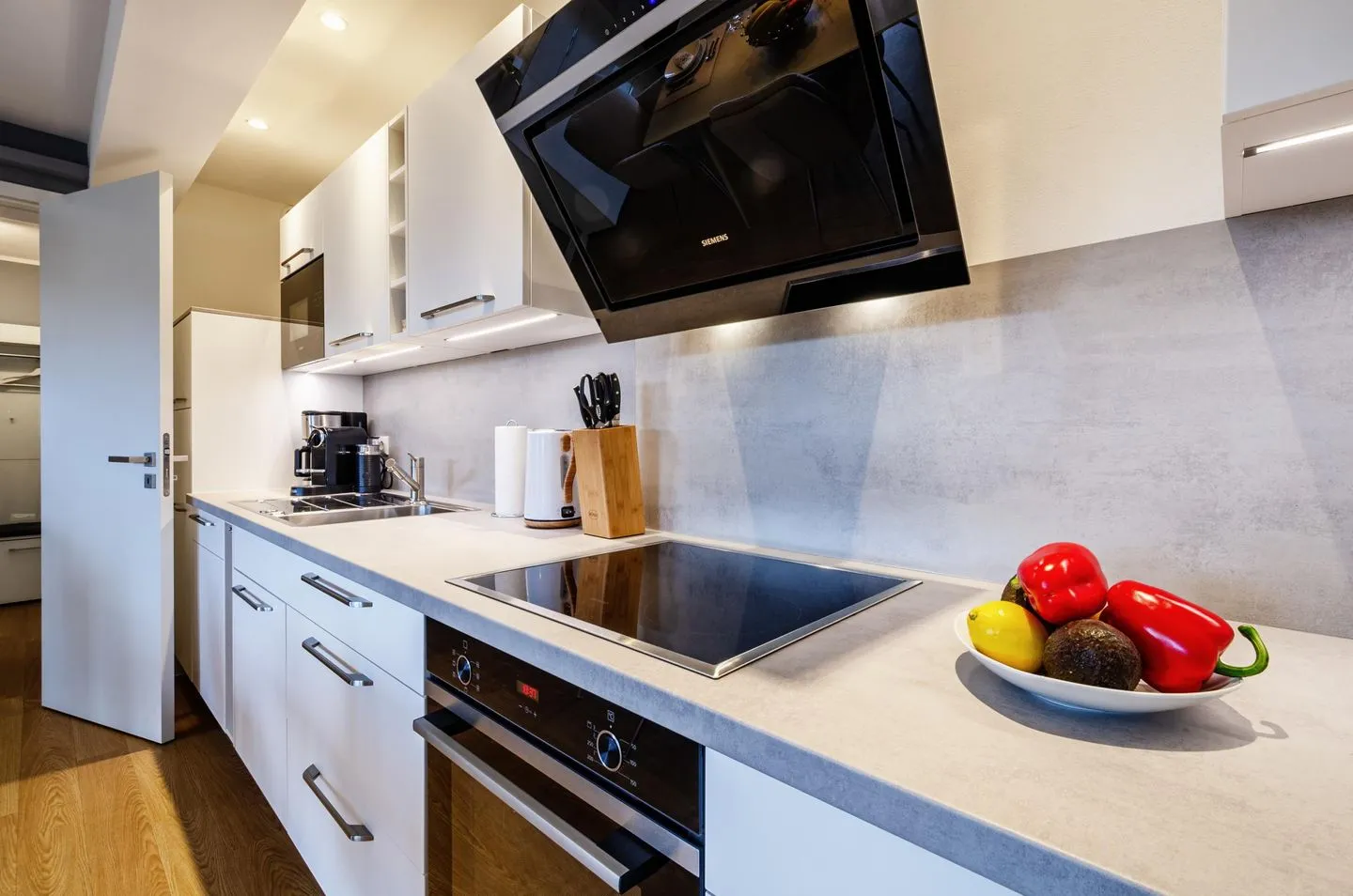 - Wohn-/Essbereich: Sofa, TV (Magenta-TV, Netflix-fähig), Bluetooth-Soundbar, Echtholz-Kaminofen (Kaminholz ist nicht im Leistungsumfang inbegriffen), Zugang zum Balkon