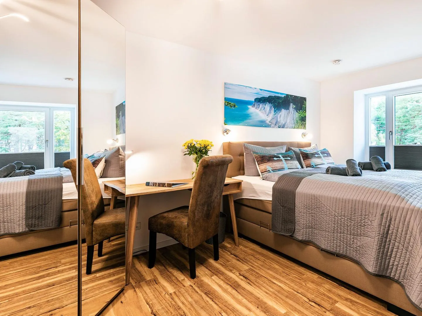 Die modern und liebevoll ausgestattete Nichtraucherwohnung befindet sich im 1.Obergeschoss des Hauses "Zudar" in Block III. Beim Betreten des Wohnzimmers blicken Sie durch die riesige Fensterfront mit Schiebetür auf den großen Balkon in Richtung Meer. Das sonnendurchflutete Apartment besitzt zwei Schlafzimmer, beide mit einem Boxspring-Doppelbett (180x200cm) und einem Schreibtisch mit LAN-Anschluss. Zudem befindet sich im Wohnzimmer ein Ledersofa mit integrierter Matratze (140x190cm). Alle Fenster können verdunkelt werden. Für den optimalen Schlafkomfort stehen verschiedene Bettdecken und Kissen bereit. Insektenschutzgitter und Ventilatoren sorgen in beiden Schlafzimmern für einen erholsamen Schlaf auch im Sommer. Der großzügige Esstisch lässt die Familie zusammenkommen. Gleich daneben können Sie köstliche Speisen in einer modernen, vollausgestatteten Küche zubereiten. Zwei hochwertig ausgestattete Duschbäder mit WC lassen Raum für Privatsphäre. In der großzügigen Garderobe haben sie genügend Platz für Jacken und Schuhe.