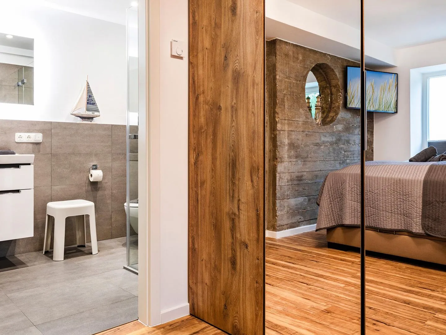 Atmen Sie die Geschichte von Prora. Der größere Teil der Wohnung liegt in den ursprünglich loftartigen "Liegehallen", wodurch die Fenster die komplette Raumbreite einnehmen. Das seeseitige Schlafzimmer mit anschließendem En-suite Bad liegt in dem ursprünglichen Bettenteil, bei dem ein tiefer Fenstersims den Blick vom Bett auf die Dünen erlaubt. Es gibt nur wenige Wohnungen, die in beiden Gebäudeteilen liegen, was die Ferienwohnung noch einzigartiger macht. Der historische Charakter wurde in dem seeseitigen Schlafzimmer aufgegriffen, indem die Originalbetonwand samt Bullauge bewahrt und aufgearbeitet wurde.