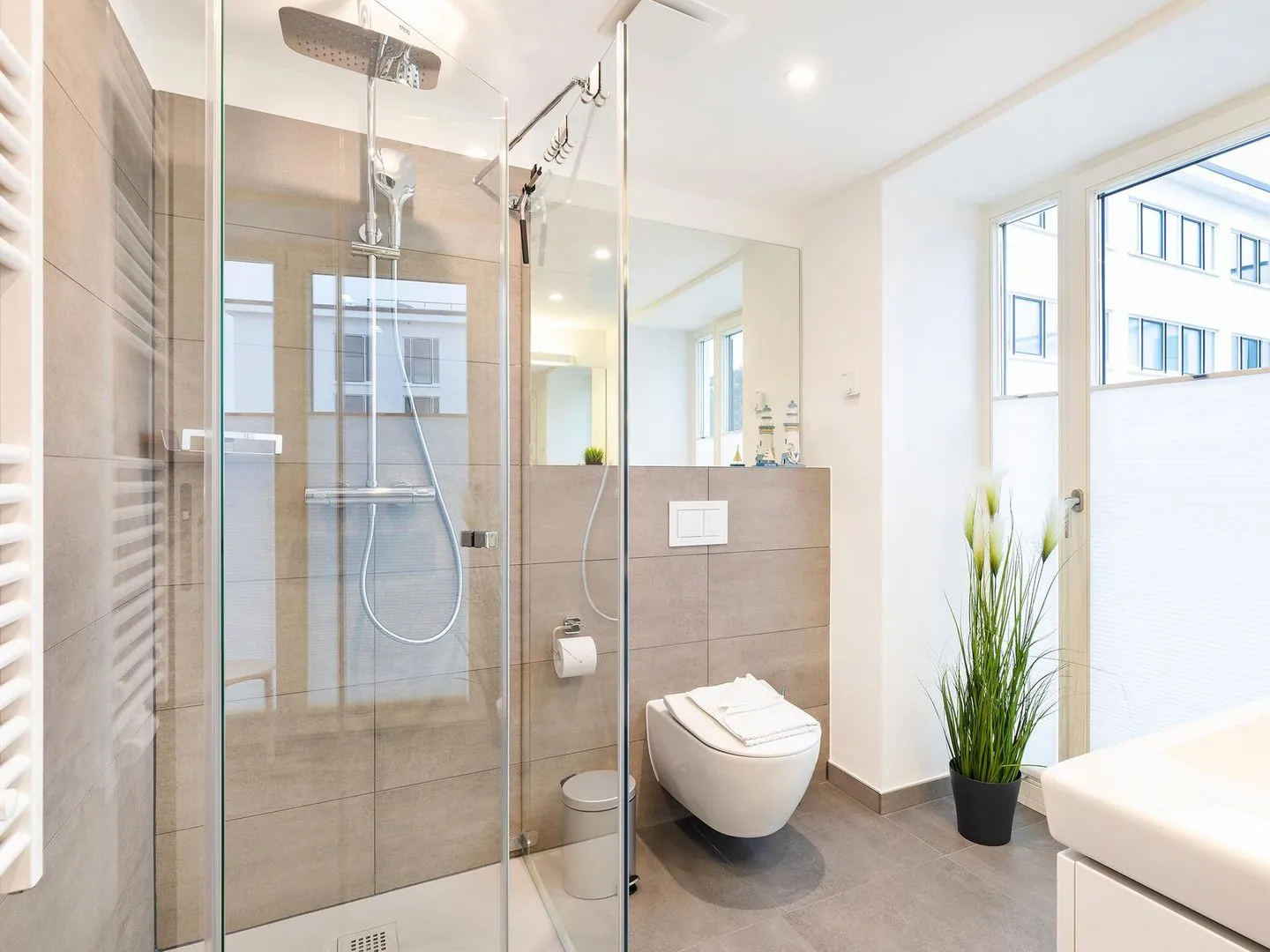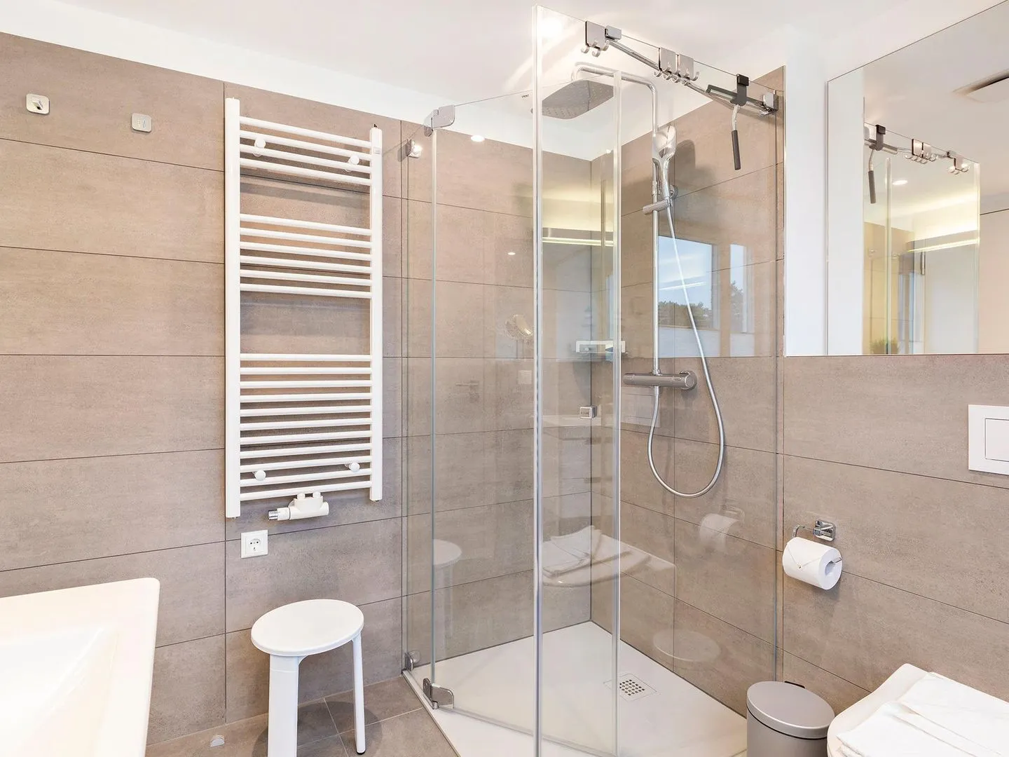 - Badezimmer: Regendusche, WC, Haartrockner