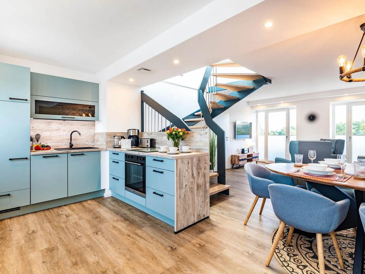 - Wohn/Essbereich: Schlafsofa (140x200), Sitzbereich, Essbereich, TV, Zugang zum Balkon