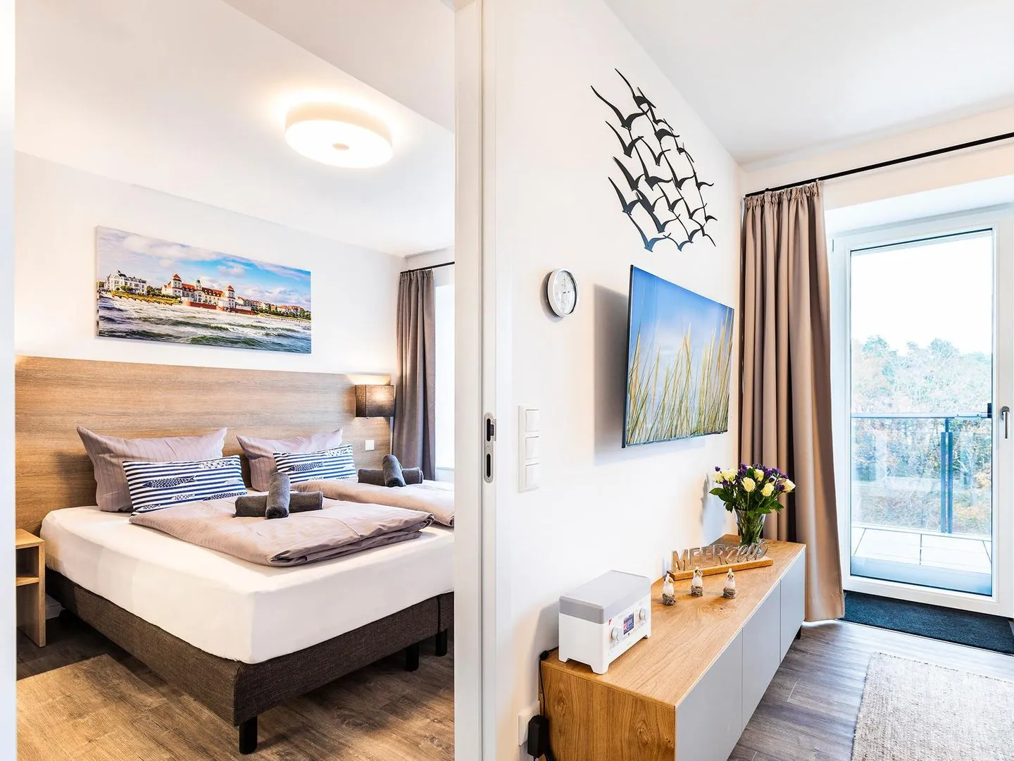 - Wohn-/Essraum: Sofa, TV, Zugang zum Balkon