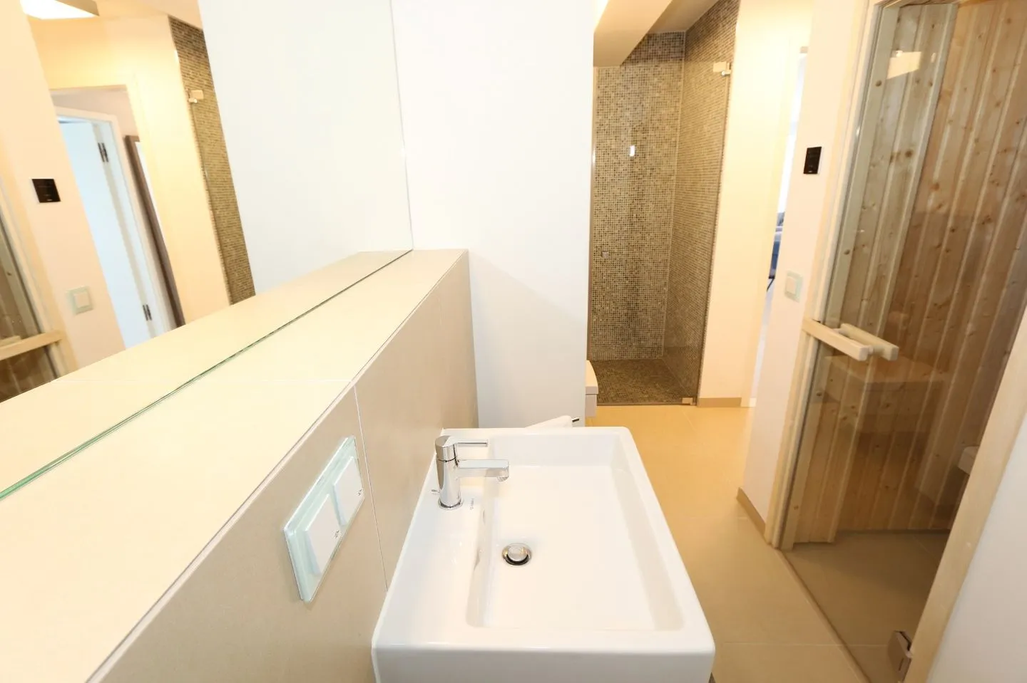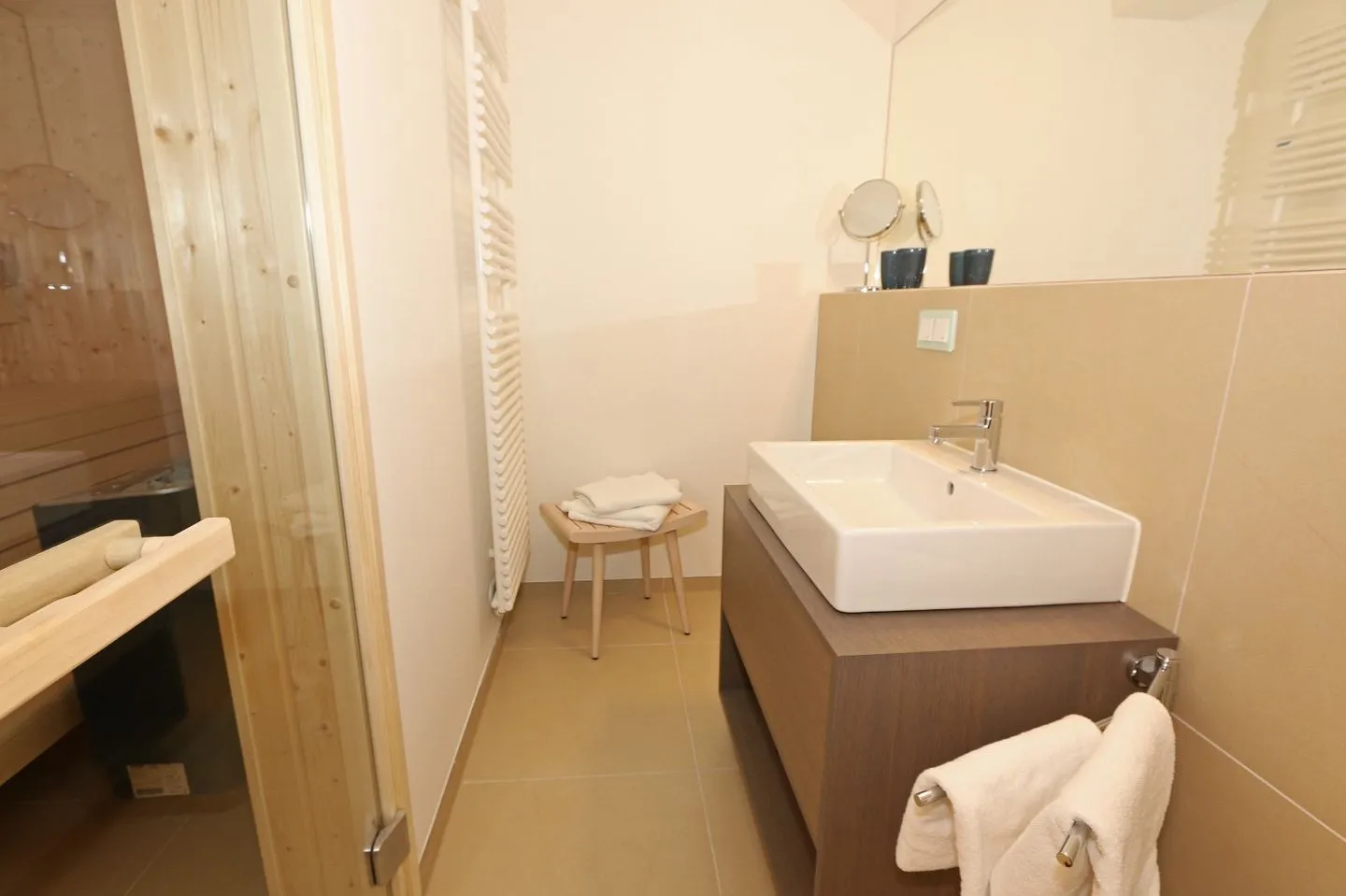 - Badezimmer 1: Dusche, Kosmetikspiegel, WC, Haartrockner, Sauna