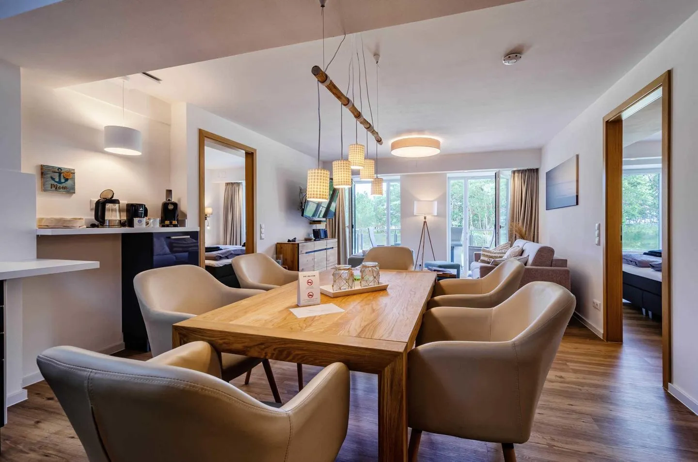 - Wohnzimmer: Schlafcouch für 2 Pers., Smart-TV 55 Zoll, Essbereich, Zugang zum Balkon