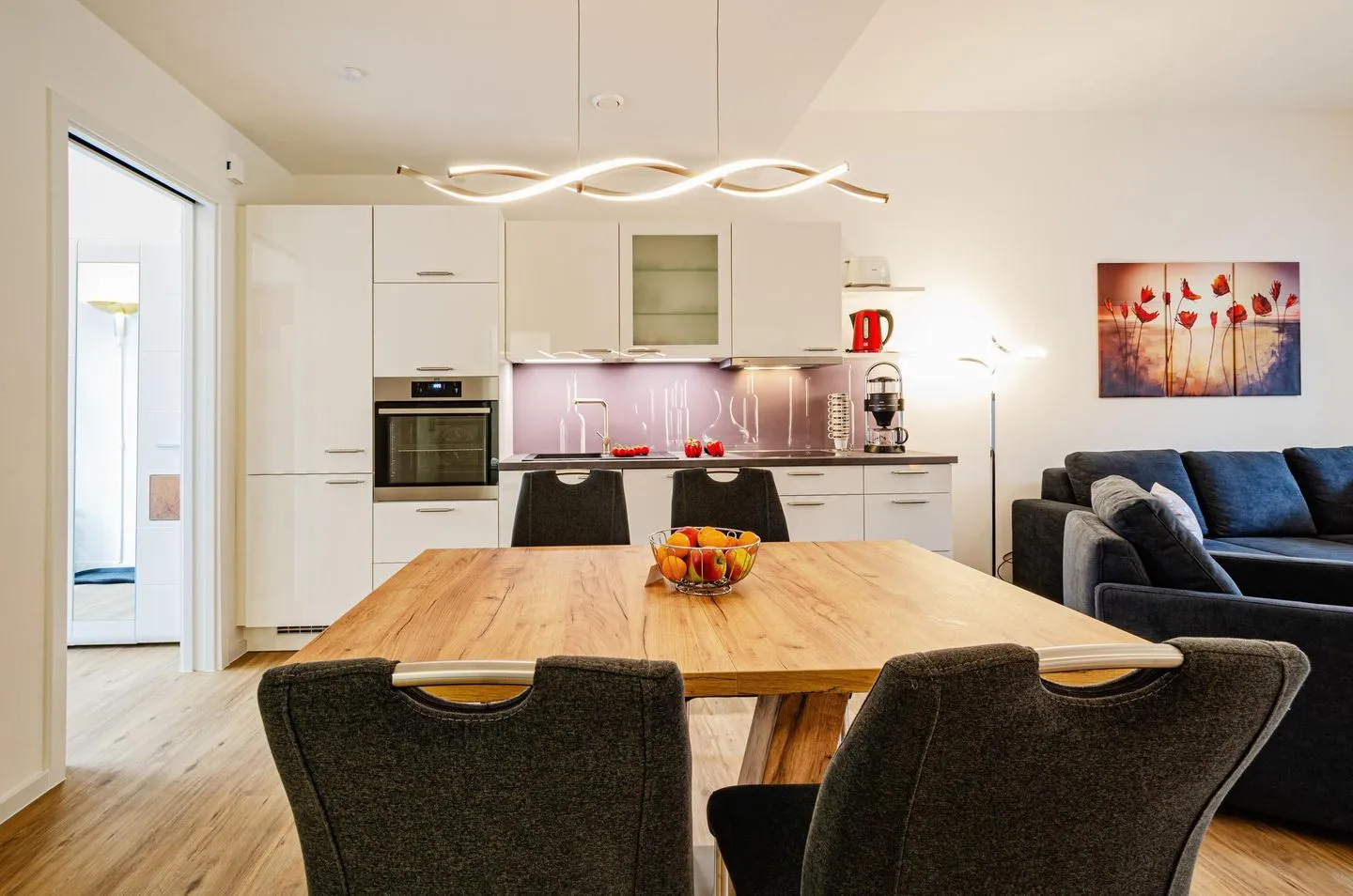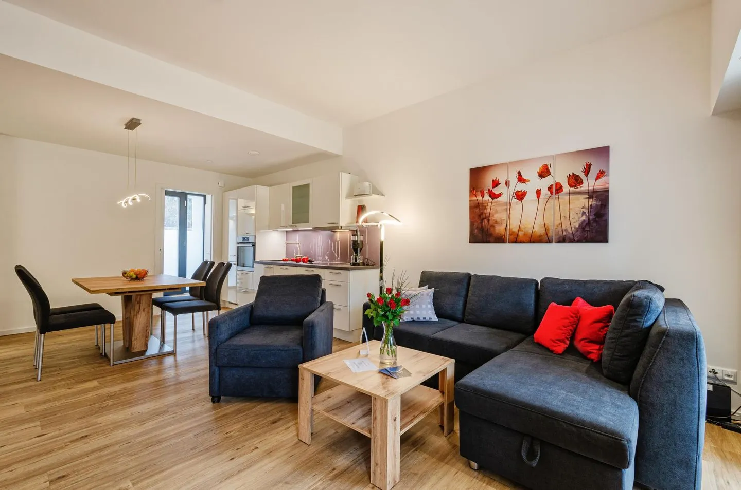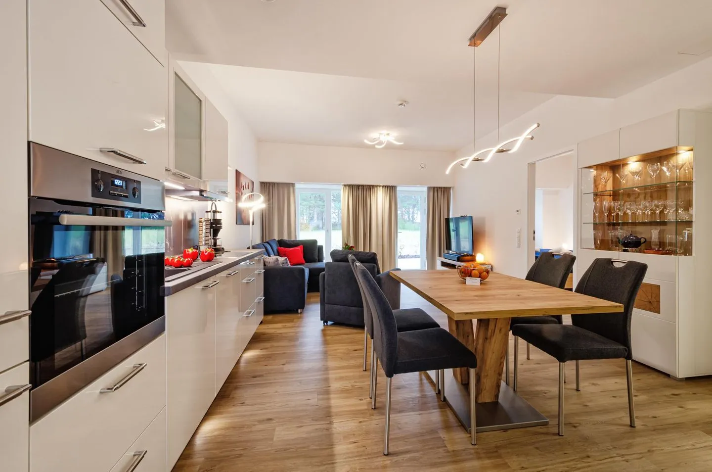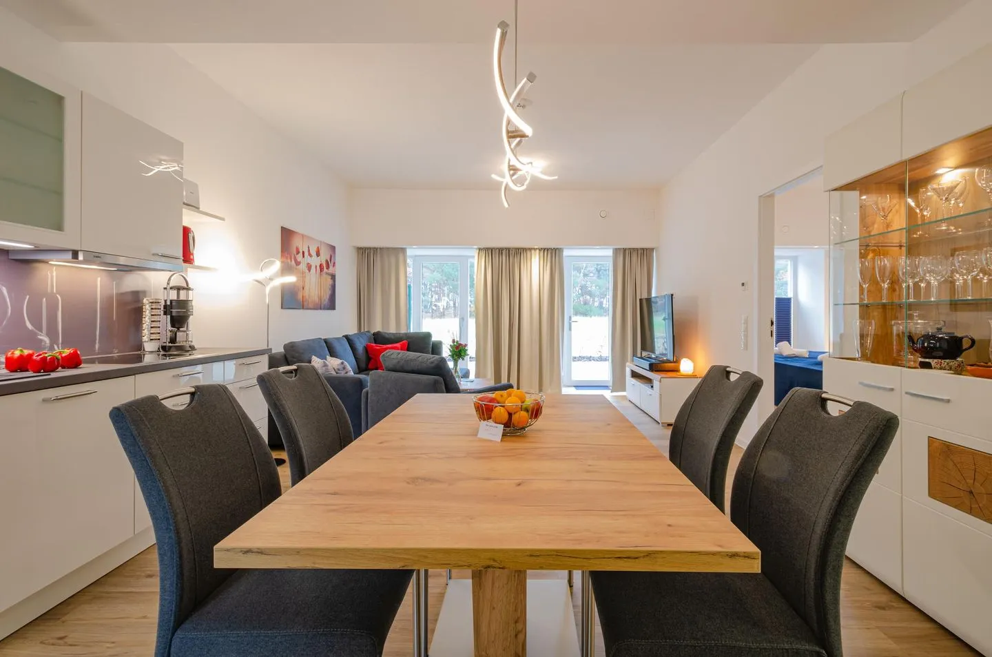 Diese Ferienwohnung besteht aus einem großzügigen Raum mit einem Wohn- und Essbereich und einer offenen Küche, zwei separaten Schlafzimmern und einem Bad.