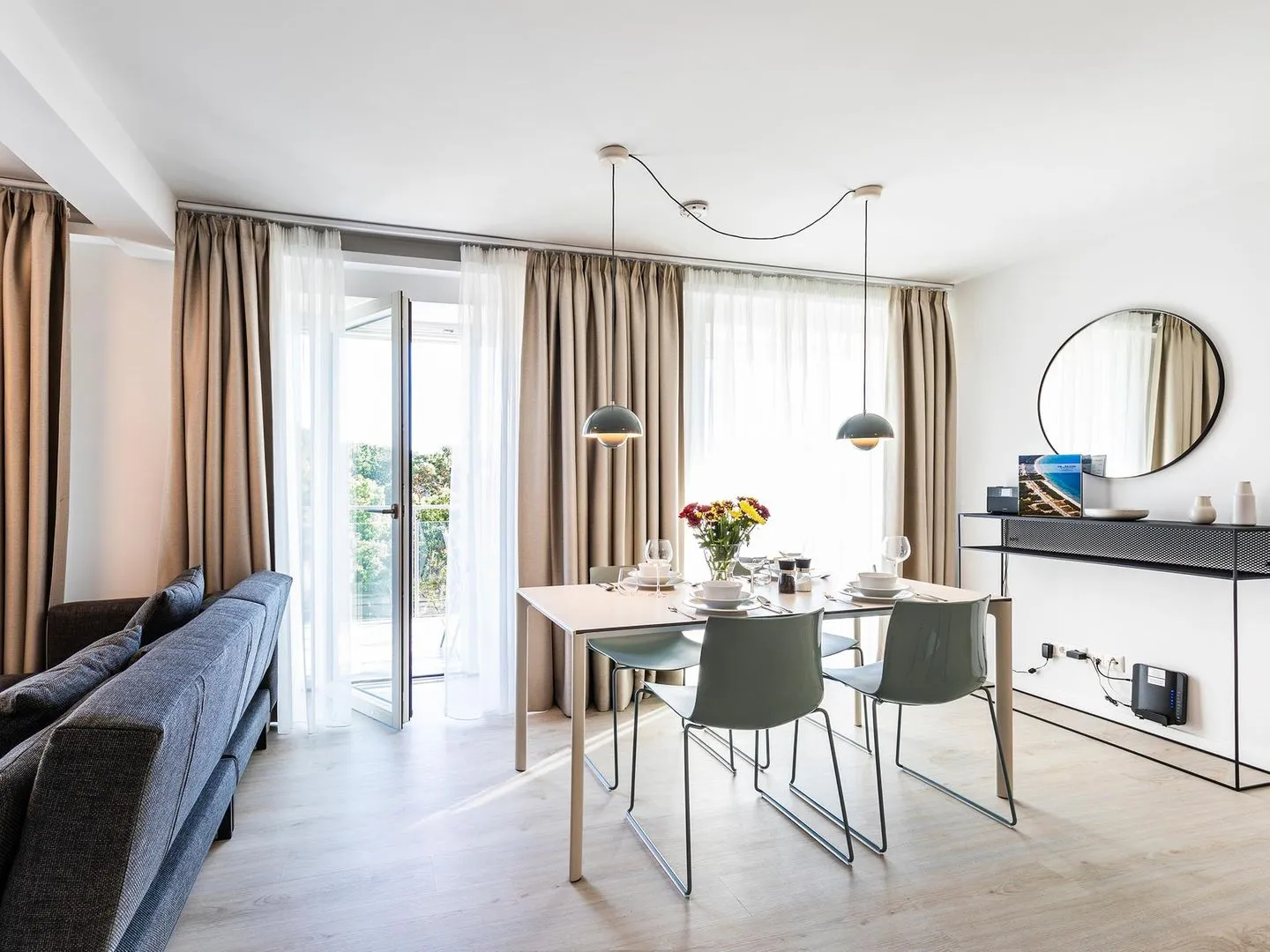 - Wohnzimmer: Schlafsofa, TV, Zugang zum Balkon