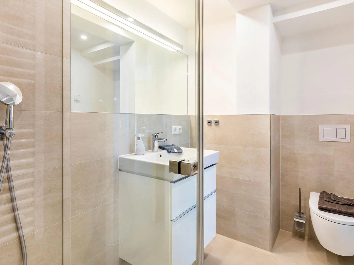 - Badezimmer: Regendusche, WC, Haartrockner
