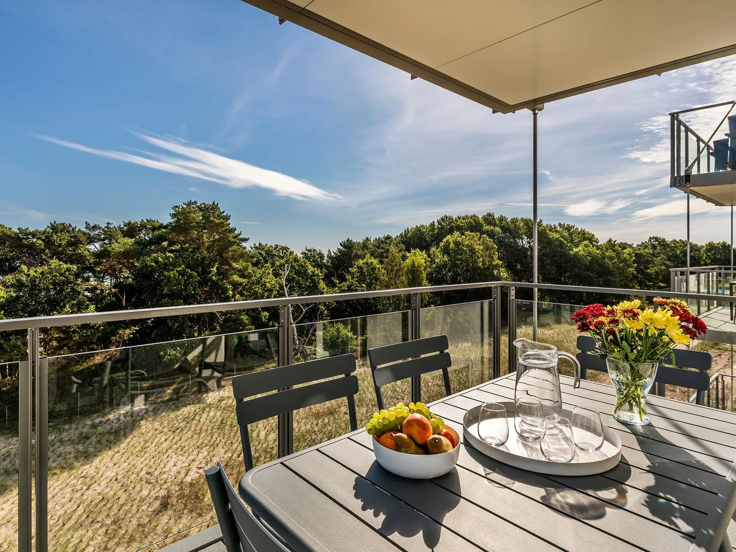 - Balkon mit Sitzmöglichkeiten, Blick Richtung Meer