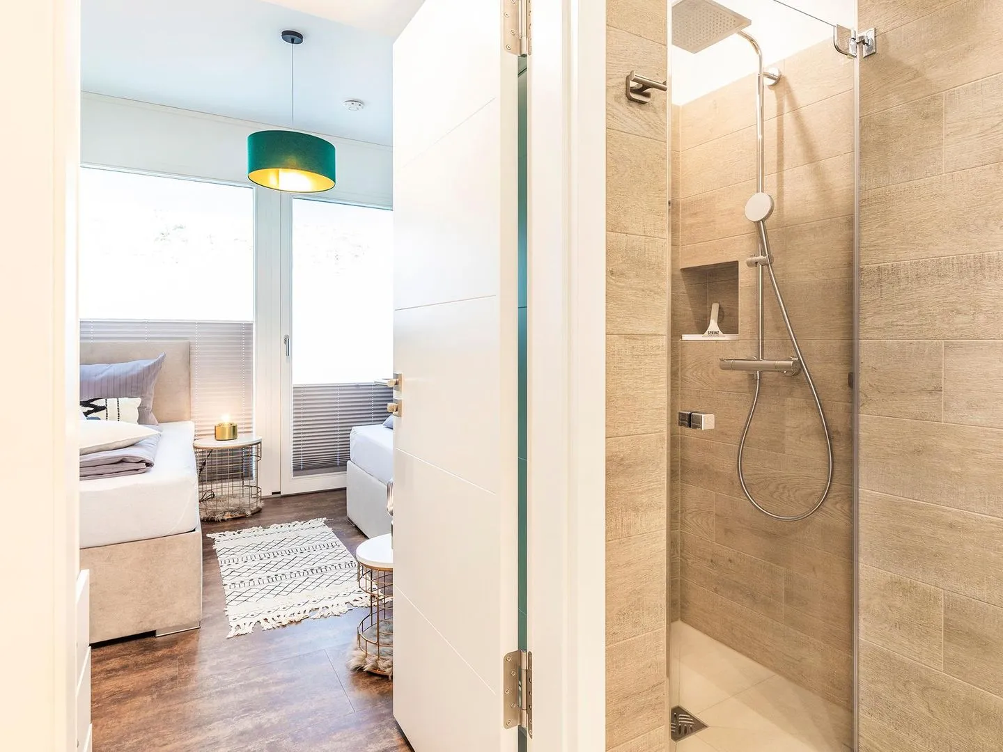 - Schlafzimmer 1 (Seeseite): Doppelboxspringbett (180x200),TV, Zugang zur Terrasse