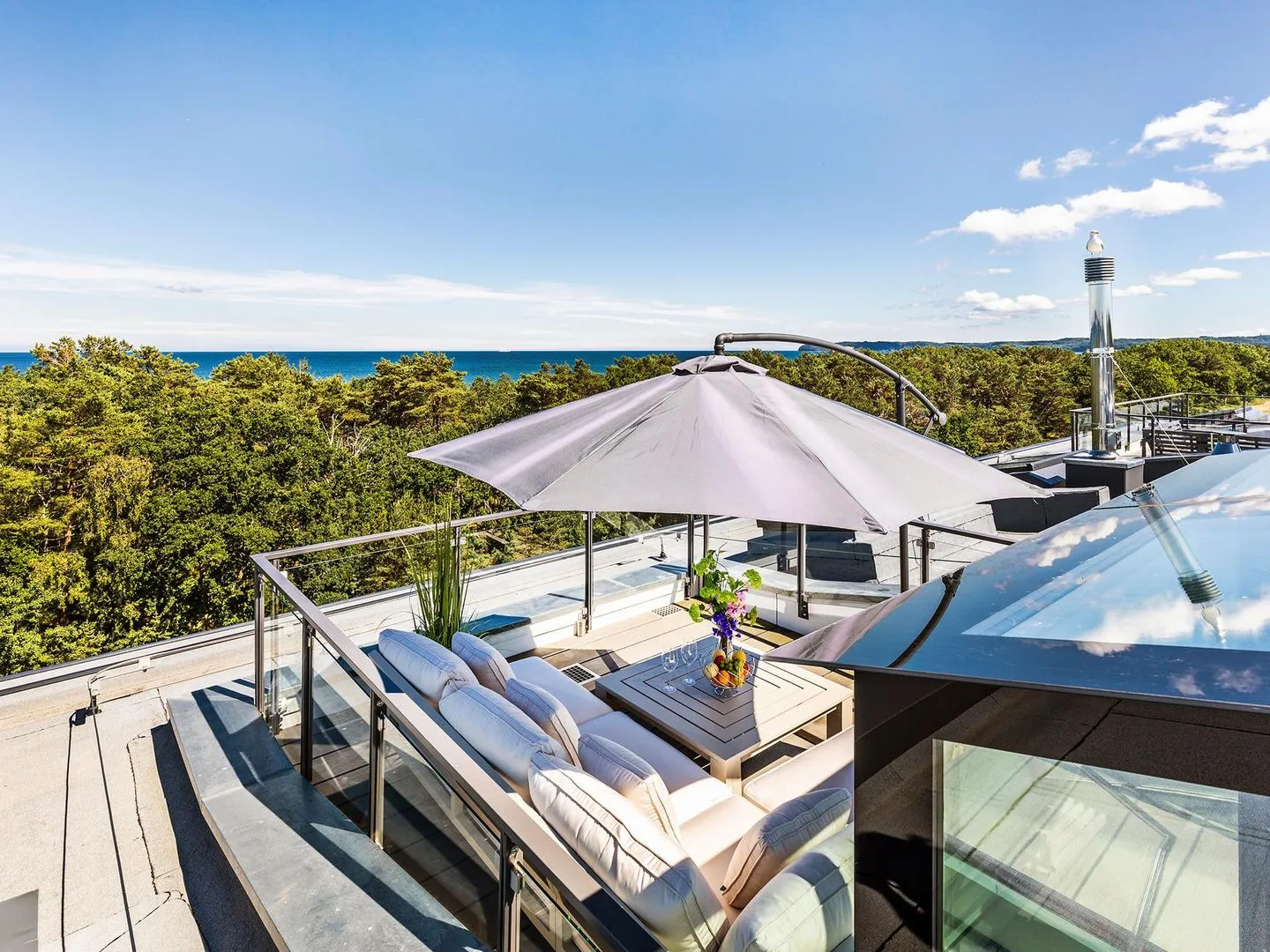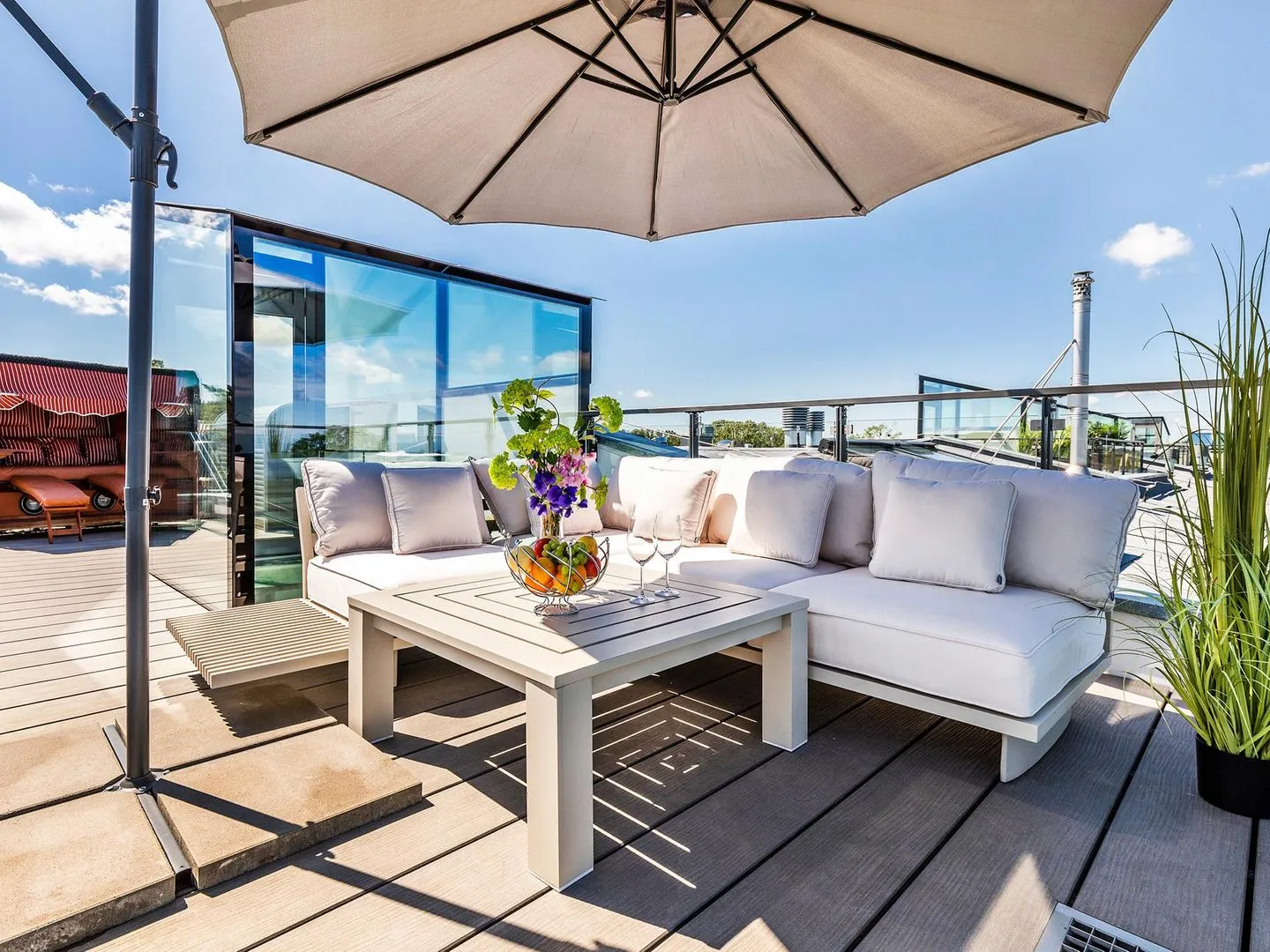 - Dachterrasse mit Sitzmöglichkeiten, Liegen, Tisch und - Strandkorb und 360-Grad-Rundumblick