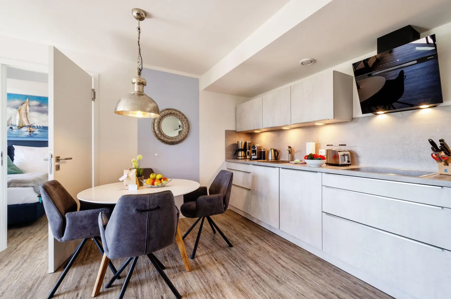 Die liebevoll eingerichtete Ferienwohnung in der 4. Etage erreichen Sie über ein großzügiges Treppenhaus oder einen gläsernen Fahrstuhl. Das Appartement bietet genug Platz für vier Personen. Genießen Sie ein leckeres Frühstück in der angenehmen Morgensonne auf unserem überdachten Balkon mit Meerblick. Die gemütlichen Gartenmöbel laden zum Entspannen und Verweilen ein.