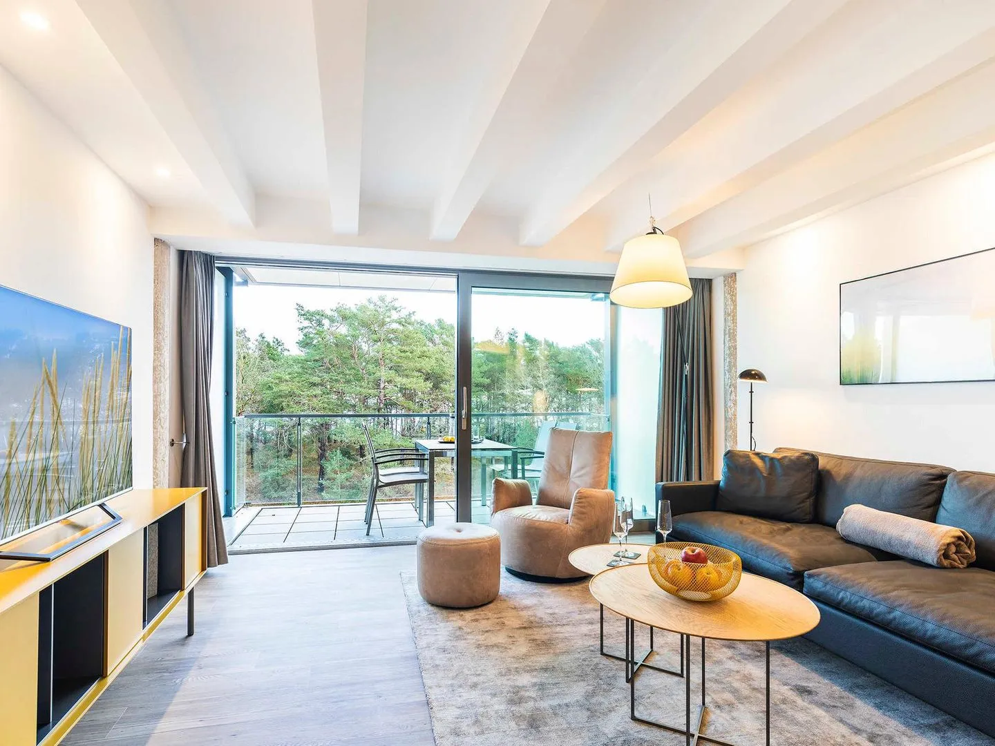 Wenn Sie Ihren Blick weiter geradeaus, Richtung Wohnbereich, schweifen lassen, haben Sie einen super Panoramablick auf die Ostsee. Der großzügige Balkon mit Sitzmöglichkeit für bis zu 4 Leuten, lädt zum Verweilen ein. Durch den seitlichen Sichtschutz sind Sie bestens geschützt vor ungewollten Blicken.