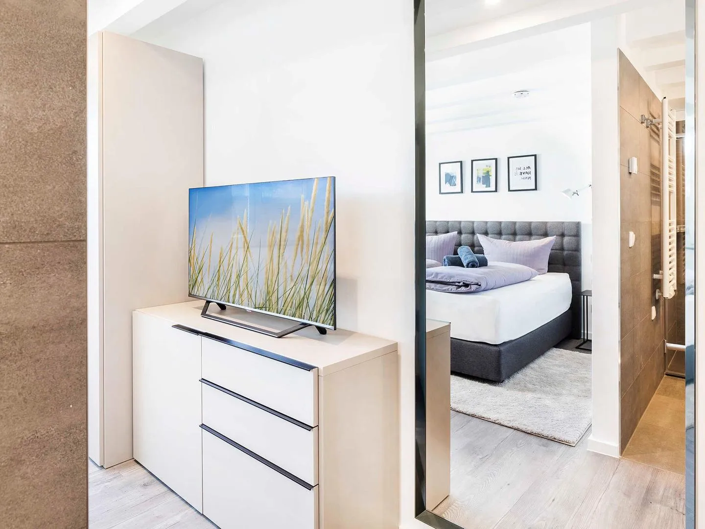 - Schlafzimmer 2: Doppelbett (180 x 200), Kleiderschrank, Kommode, Smart-TV, Panoramafenster mit Ausgang zum Balkon, Blick auf die Ostsee