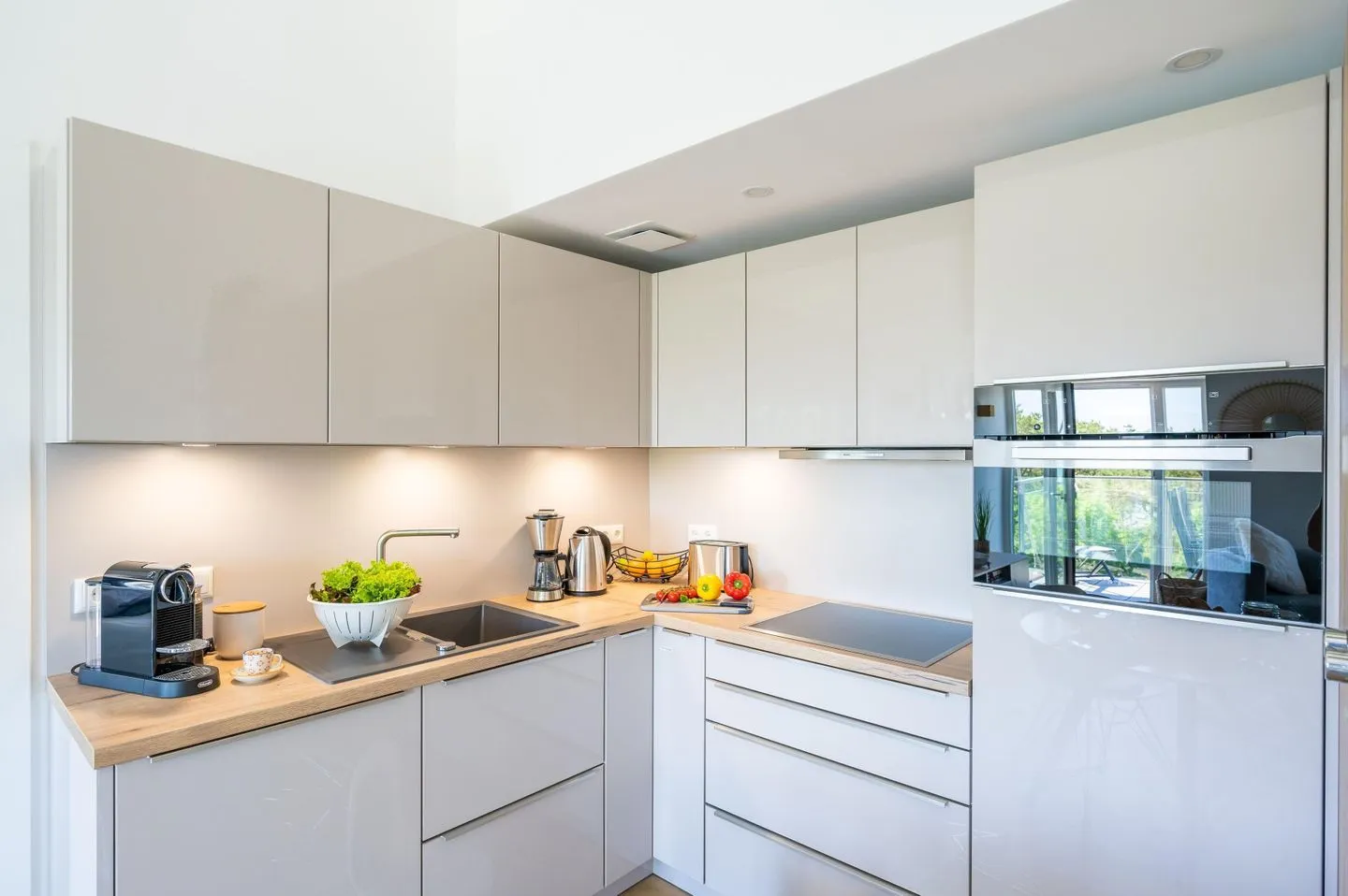 Der großzügige Wohn-/Essbereich besticht durch hohe Decken und zwei Dachflächenfenster, die mit elektrischer Außenbeschattung ausgestattet sind. Hier können Sie auf dem gemütlichen Sofa entspannen, den Meerblick vom Balkon genießen oder kulinarische Köstlichkeiten in der voll ausgestatteten Küche zubereiten. Für Kaffeeliebhaber steht eine Filterkaffeemaschine sowie eine Nespresso-Maschine bereit.