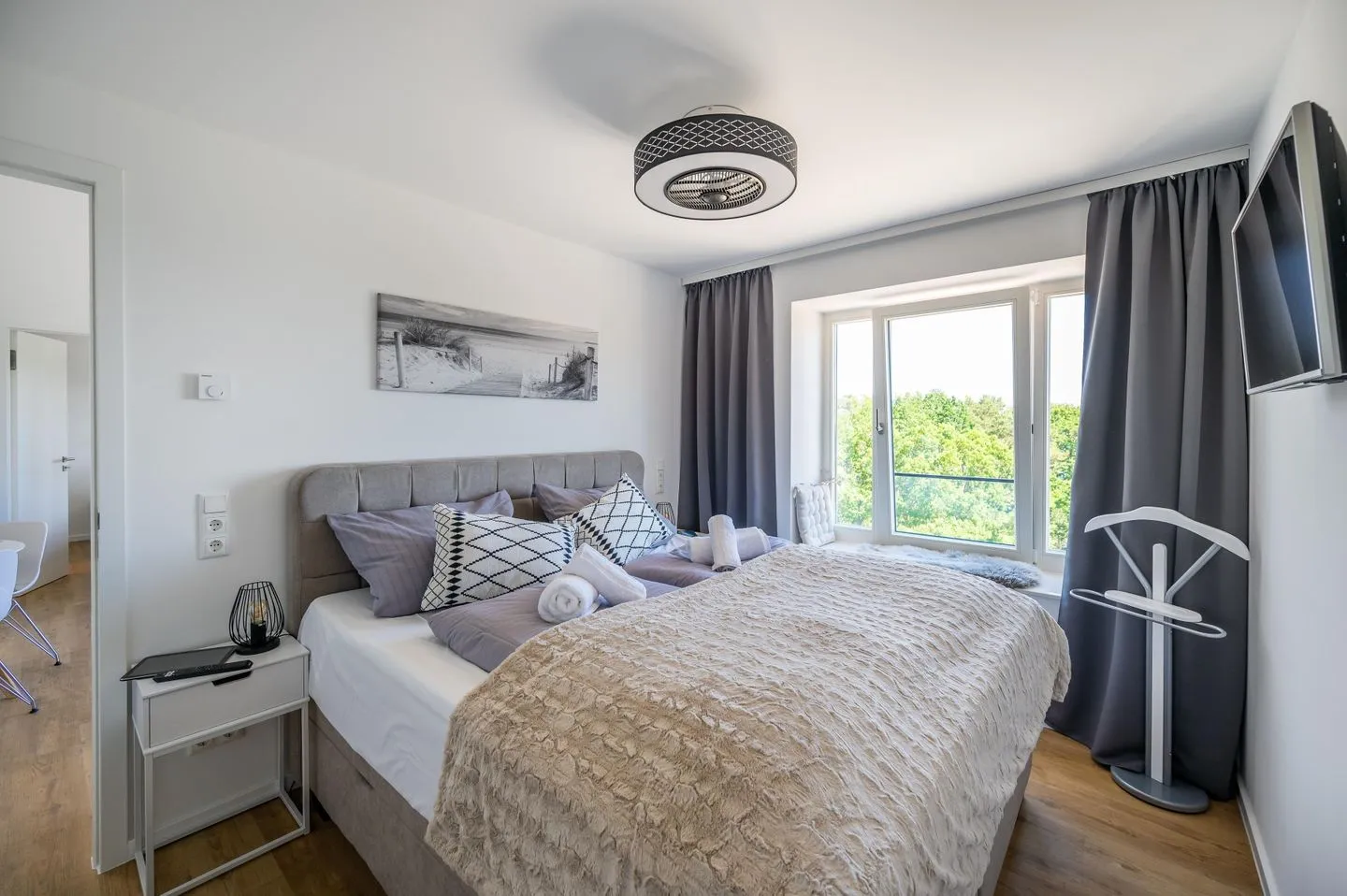 - Schlafzimmer 1: Doppelbett (180x200), Kleiderschrank, Smart-TV, Lampe mit eingebautem Ventilator