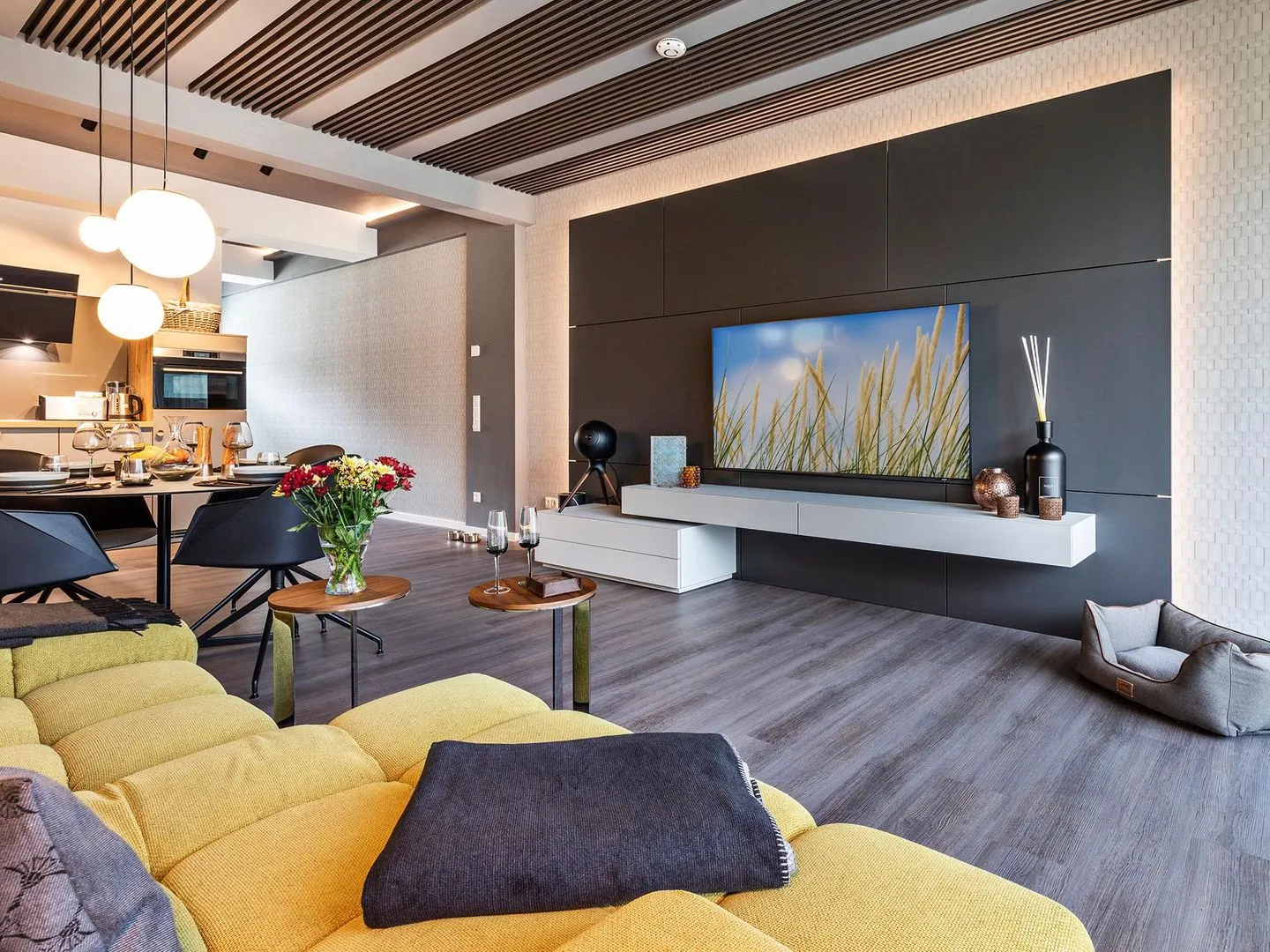 - Wohn/Essbereich: Sofa, Sitzbereich, Essbereich, TV, Zugang zur Terrasse
