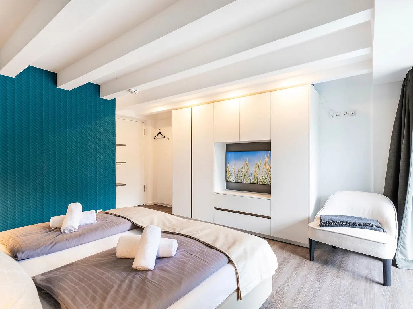 - Schlafzimmer 1 (Seeseite): 1 Doppelbett (180x200), TV, Zugang zum Balkon