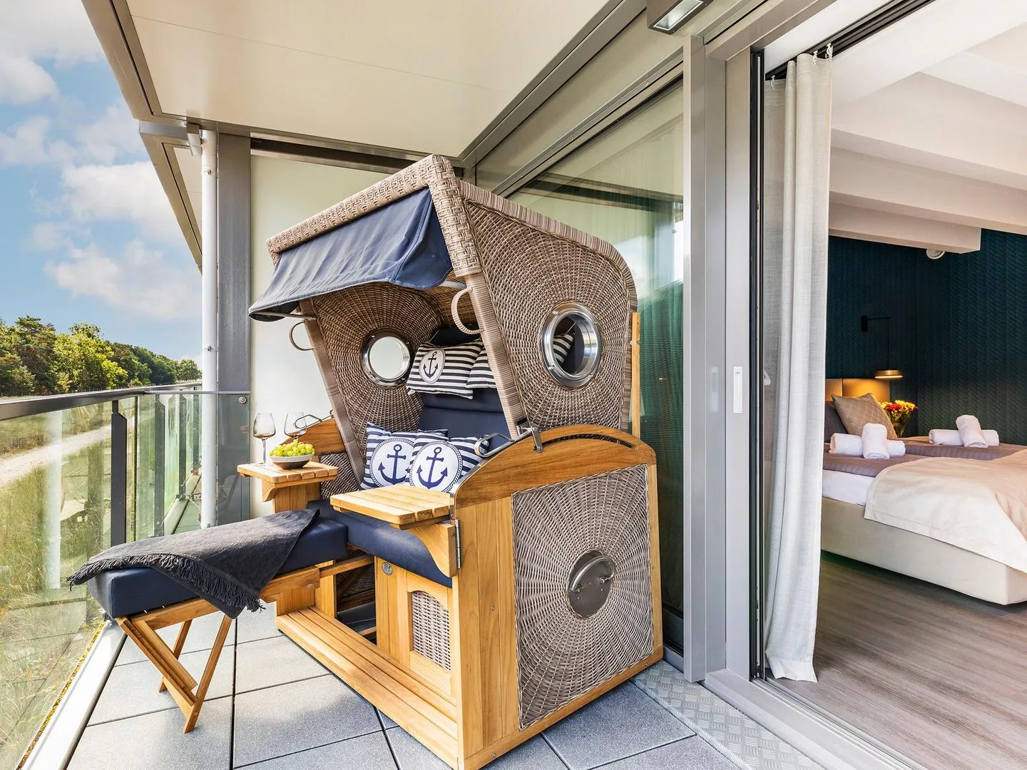 - Balkon mit Sitzmöglichkeit (Strandkorb), Blick Richtung Meer