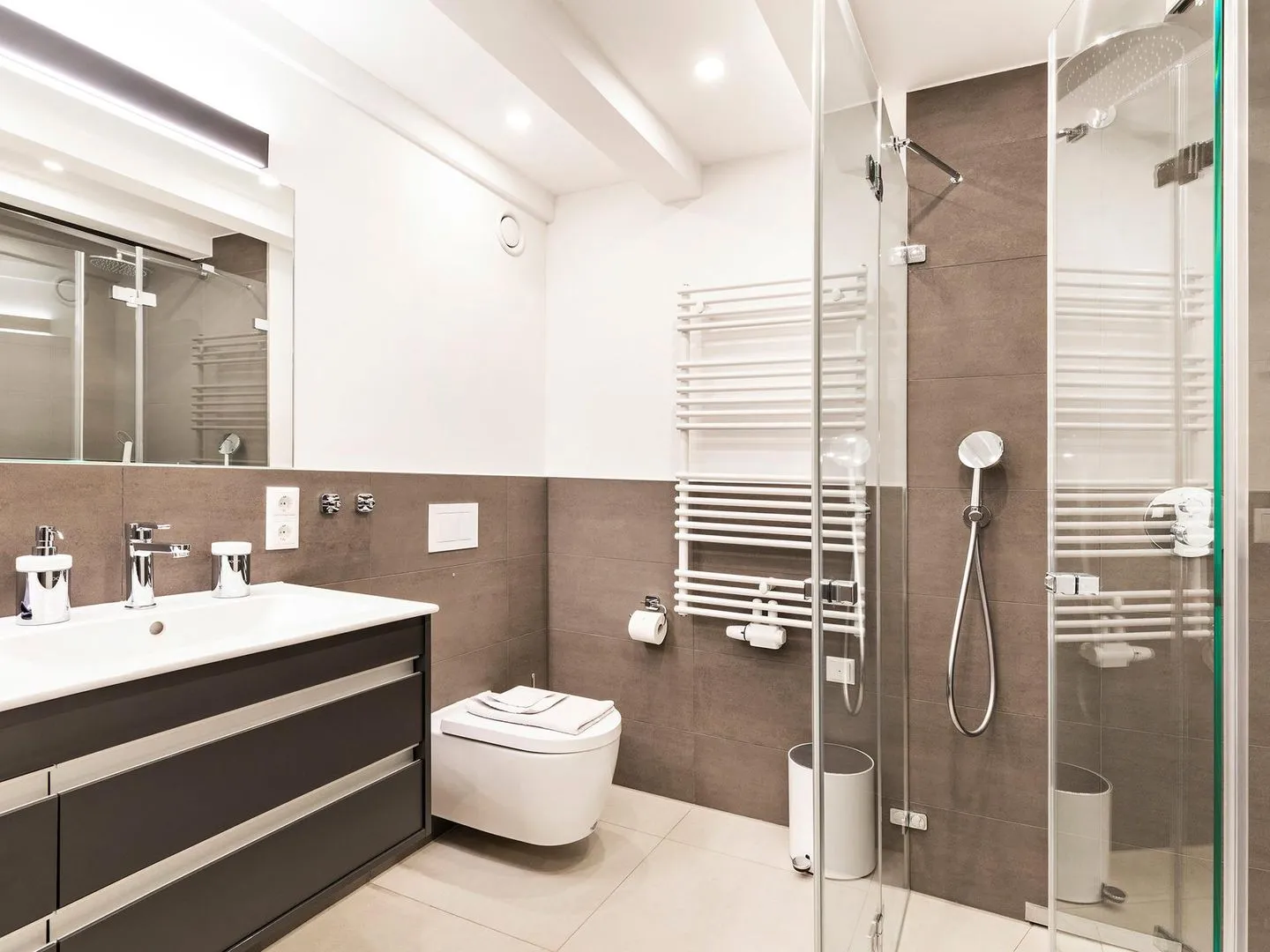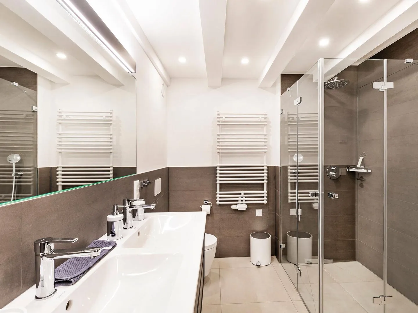 - Badezimmer: Regendusche, WC, Waschbecken, Haartrockner