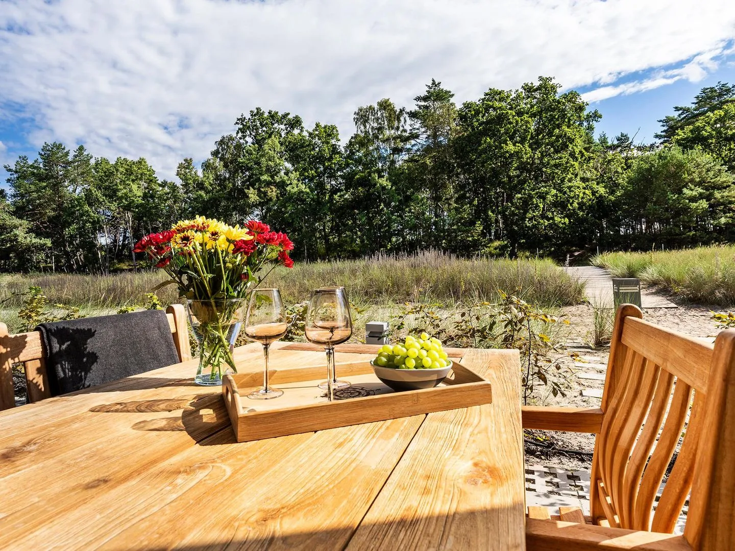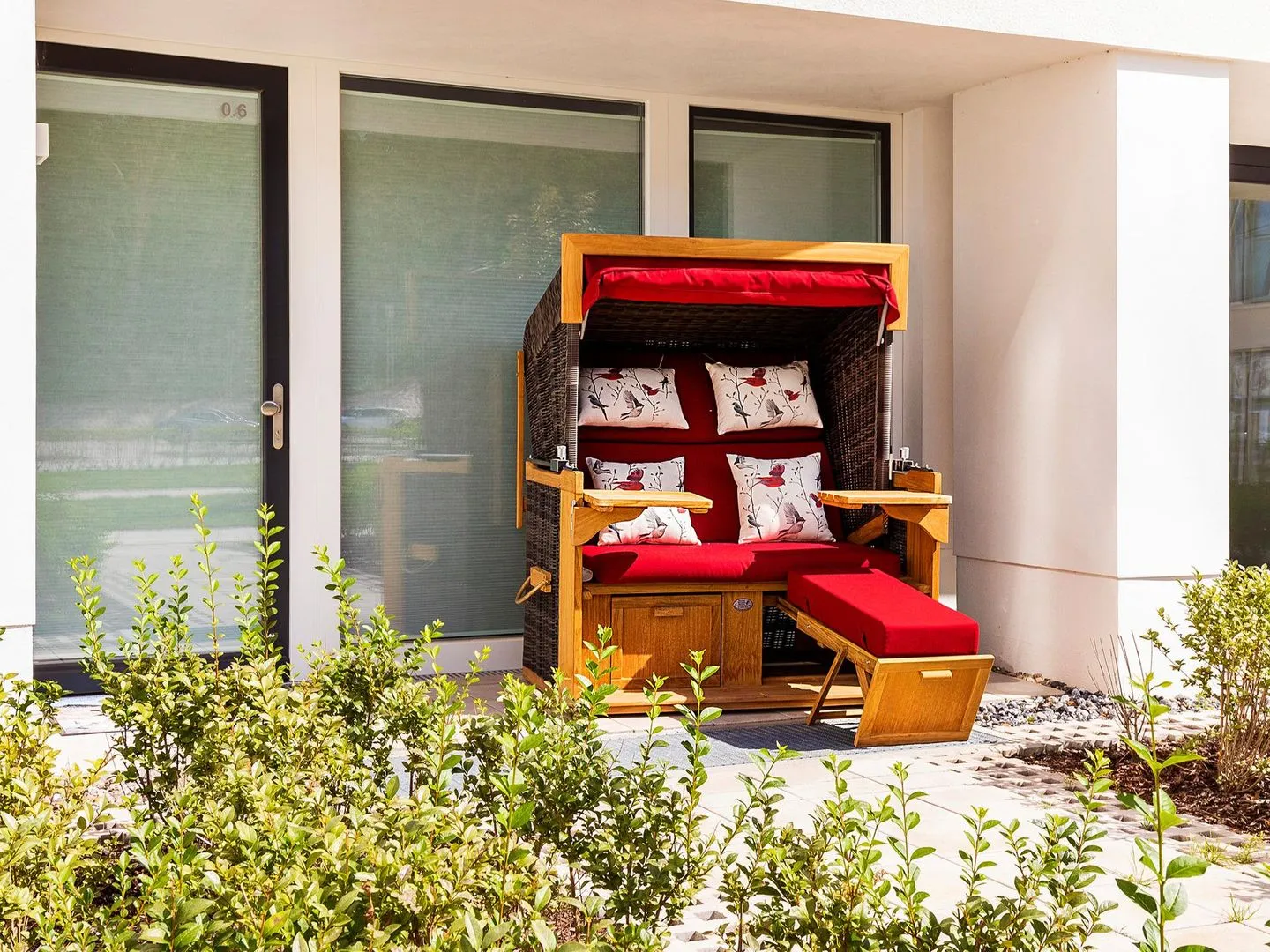 - Terrasse: Hochwertiges und gleichzeitig angenehm ergonomisch geformtes Teakmöbel mit Blick auf die Dünenlandschaft, Strandkorb Deluxe